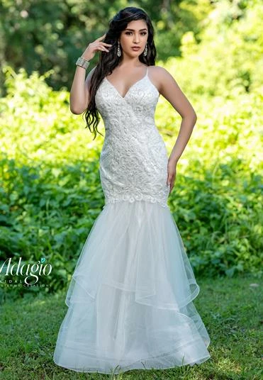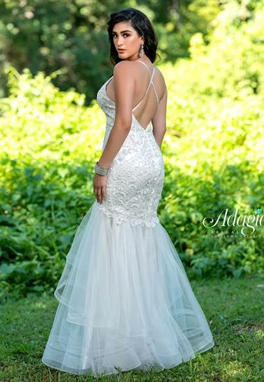 Adagio Bridal D1427 v neckline beaded applique lace with tulle layered skirt destination bridal gown wedding dress with open back