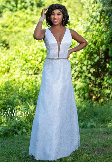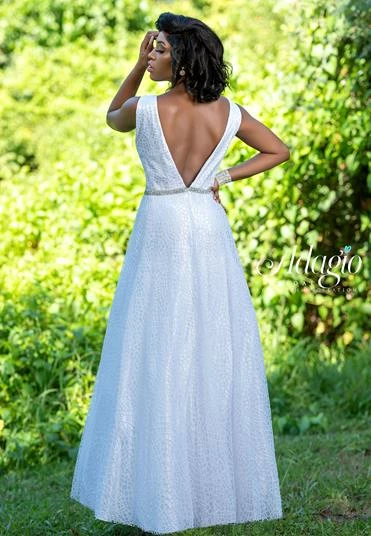 Adagio Bridal D1495 Plunging V neckline and open back beaded glitter tulle destination bridal gown wedding dress with embellished belt