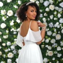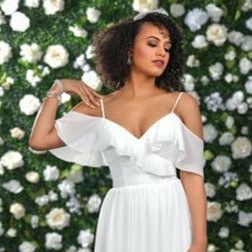 Adagio Bridal D9233 is a long Chiffon wedding dress with a V neckline and a flowing chiffon skirt. Ruffle off the shoulder chiffon straps add a touch of elegance to this gown.