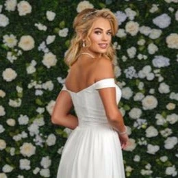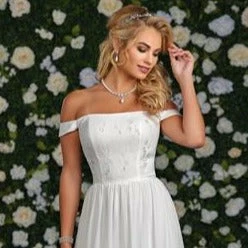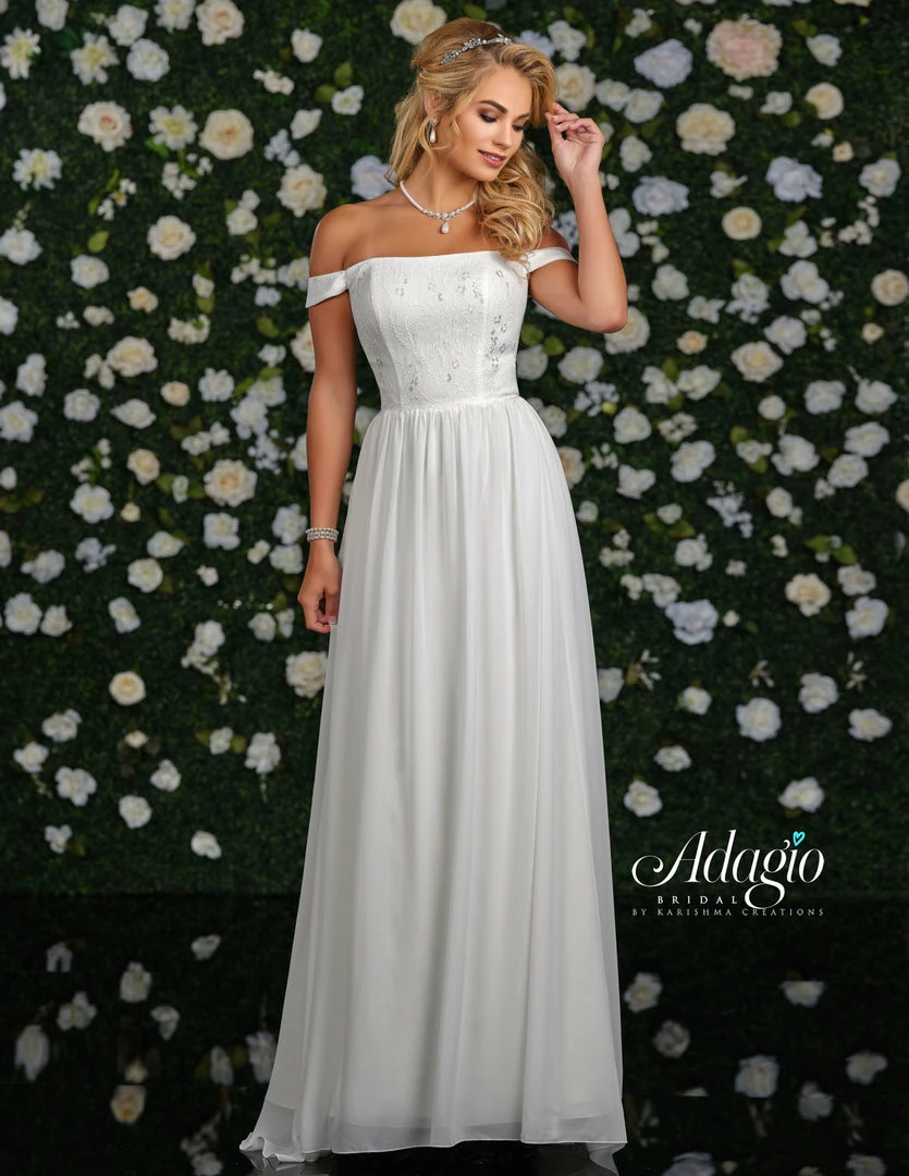 Adagio Bridal D9236 is a long Flowing Chiffon and Lace wedding dress with a straight Neckline and Off the shoulder lace Sleeves.