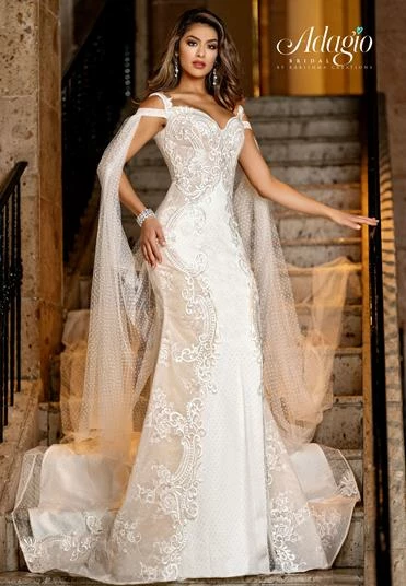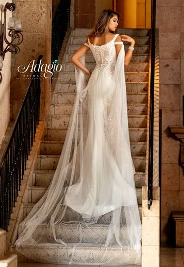 Adagio Bridal W9288 double strap off the shoulder bridal gown features flowy cape off the shoulder straps and long lace fitted skirt. 9288Â