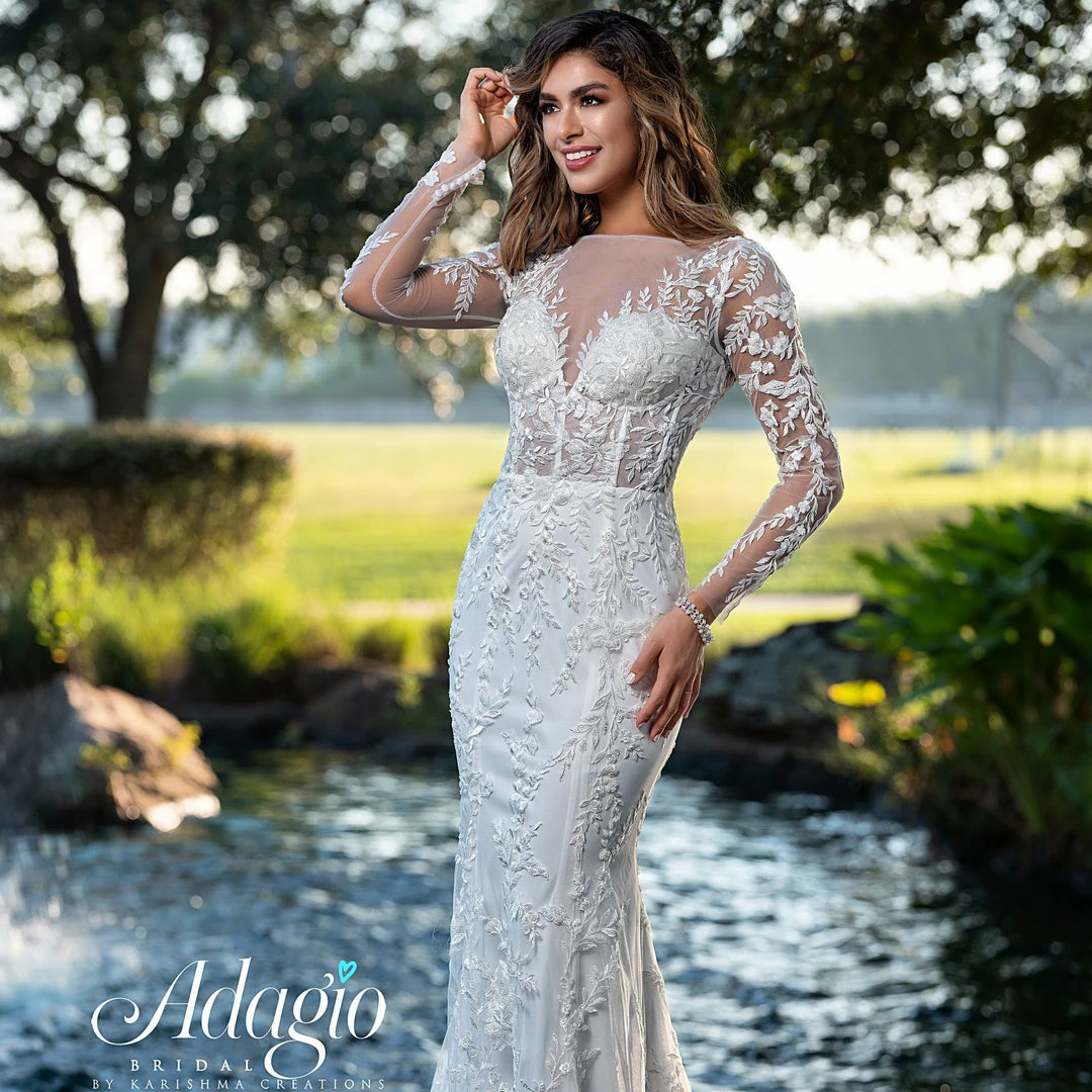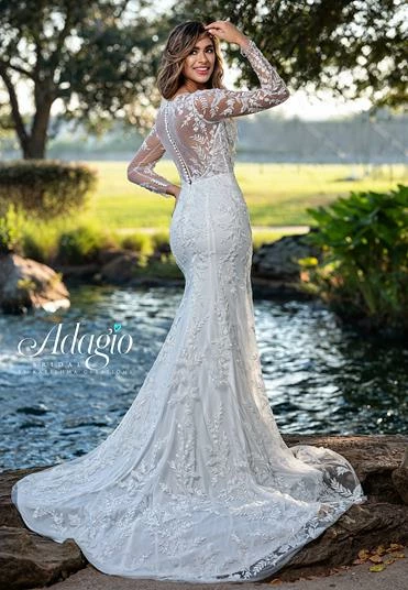 Adagio Bridal W9364 long sleeve fitted sheer corset style beaded lace wedding dress bridal gown with sheer neckline and sheer lace sleeves. The back is sheer lace with bridal buttons down the back