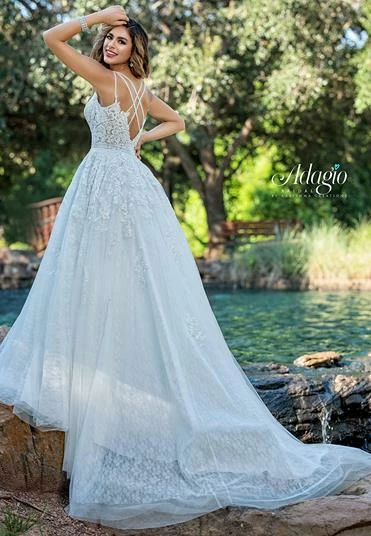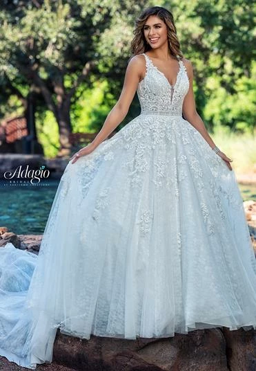 Adagio Bridal W9371 plunging v neckline with mesh panel beaded applique tulle with rows of horizontal lace around the waistline that extends the waistline and lace flowing down the length of the wedding dress bridal gown ball gown