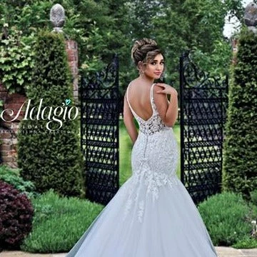 Adagio Bridal W9380 beaded lace fit and flare wedding dress with long tulle train with lace streaming down the top of the skirt, sheer lace back and bridal buttons down the backÂ