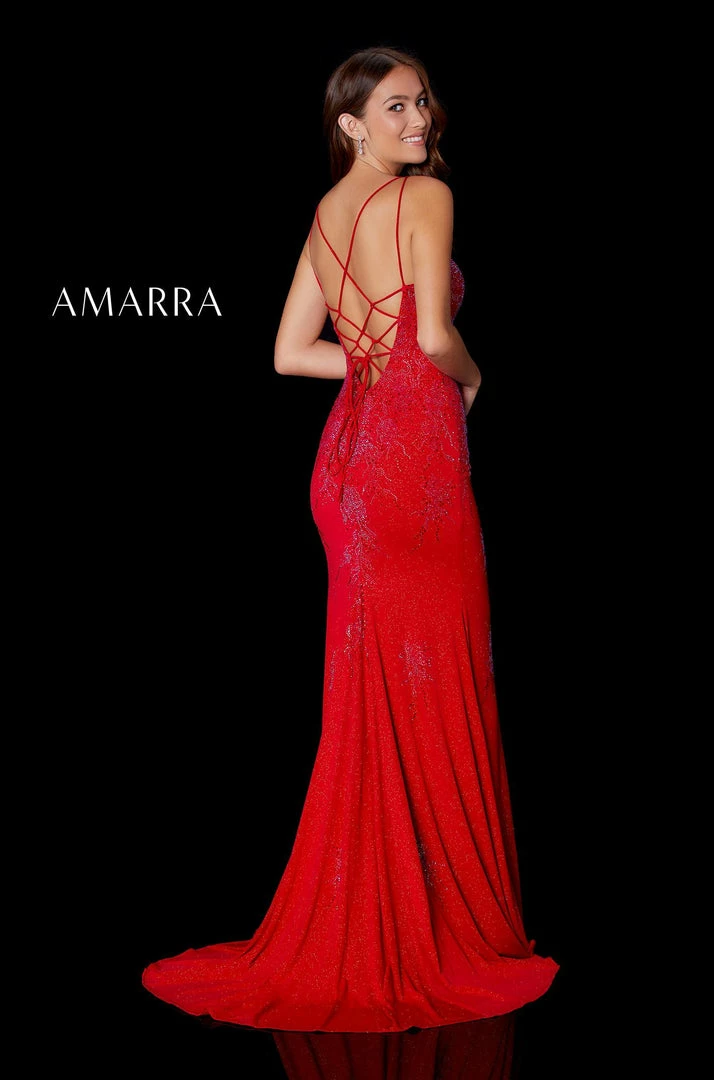 Amarra 87247 Long Fitted Jersey Rhinestone V Neck Slit Backless Corset Pageant Fitted jersey gown featuring a plunging V-neckline, leg slit, lace-up back and sweep train, and floral rhinestone design. shimmer jersey