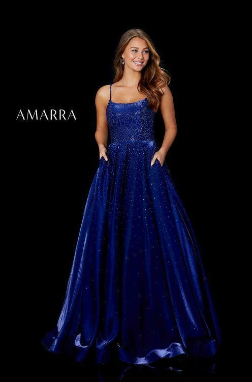 Amarra 87278 Satin rhinestone ball gown featuring a scoop neckline, skirt with pockets, and a criss-cross back.Â