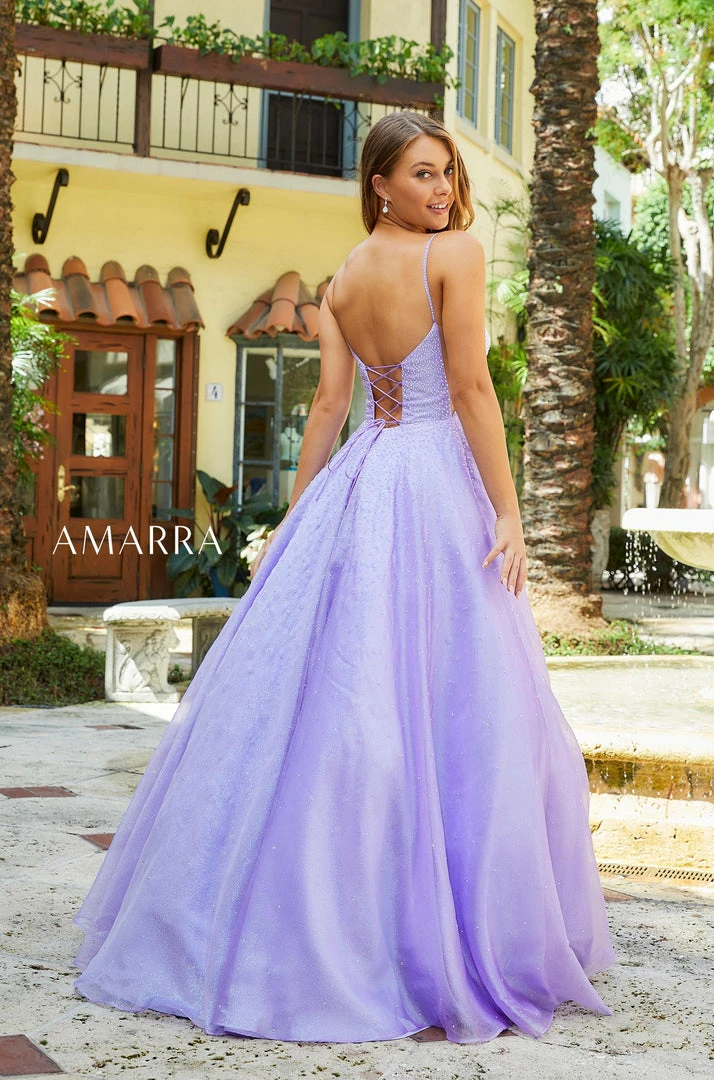 Amarra 87295 Long A Line Shimmer Ball Gown Prom Dress Pockets Backless Corset Shimmer rhinestone ball gown featuring a scoop neckline, skirt with pockets, and criss-cross back.