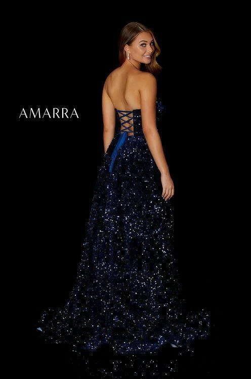 This head-to-toe sequin style is unlike any other. AMARRA 87409 is a strapless velvet sequin ball gown with gorgeous all-over sequin detail. The skirt has two discrete pockets so you never have to worry about misplacing your belongings while youÂ’re out having the time of your life. Behind features a simple yet elegant criss-cross back that pairs perfectly with the sequinÂ’s shine. This breathtaking design has simple craftsmanship but a whole lot of glamor. Get ready to steal the night and have the time in your life, in a gown like no other.