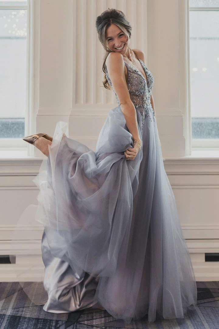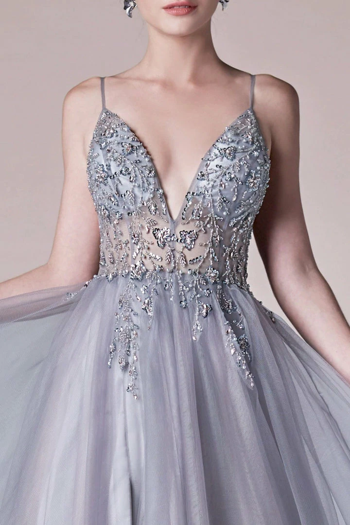 Andrea & Leo OPHELIA A0672 Long Shimmer Maxi Slit Sheer Formal Dress A Line Beaded Sexy, light, and ethereal, this gown has been a go-to gown for a wearer looking for something special but effortless. Floral beading falls flatteringly in sexy V-front and flares weightlessly at the tulle skirt with a leg slit. Double maxi slit skirt with multi collor tulle layers. Sheer V neckline with hand beaded accents.