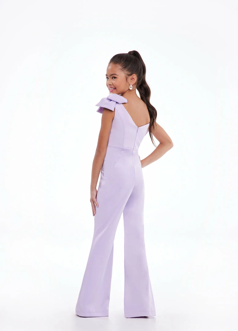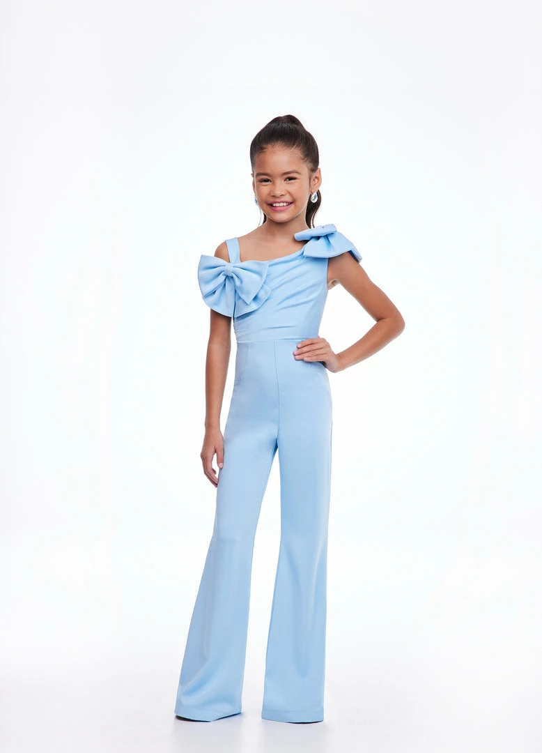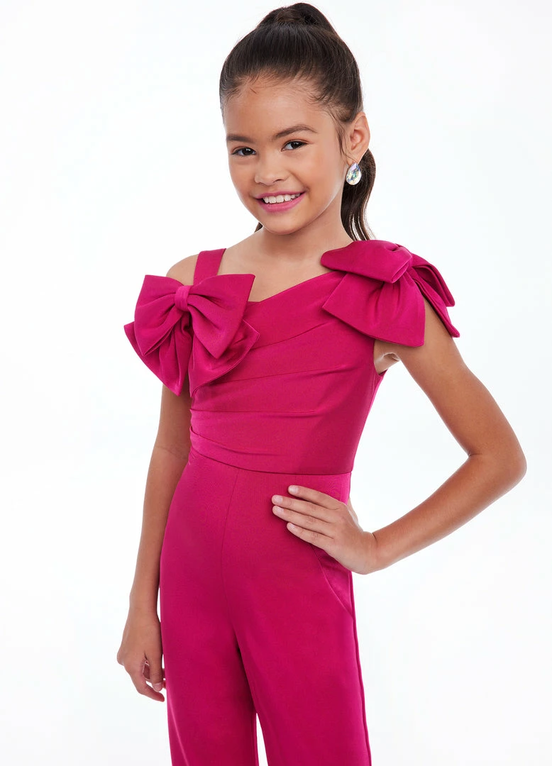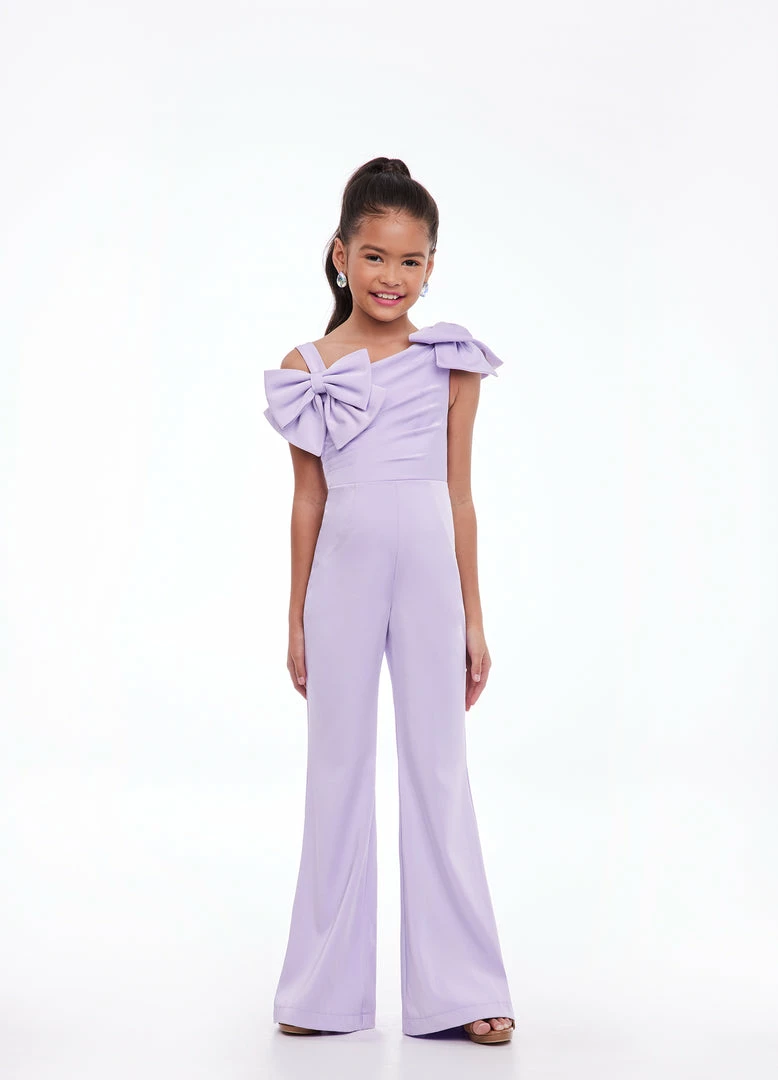 Ashley Lauren Kids 8134 Girls Crepe Jumpsuit Pageant Wear Bow off the shoulder Who doesn’t love a good bow? This crepe jumpsuit features a ruched bodice accented by two bows. The look is completed with flared pant legs.
