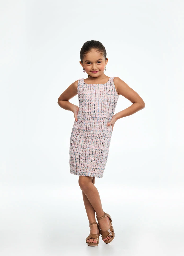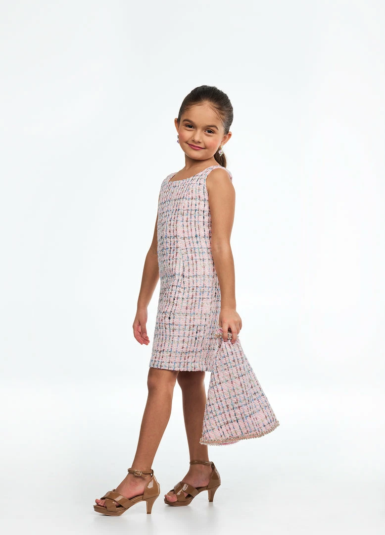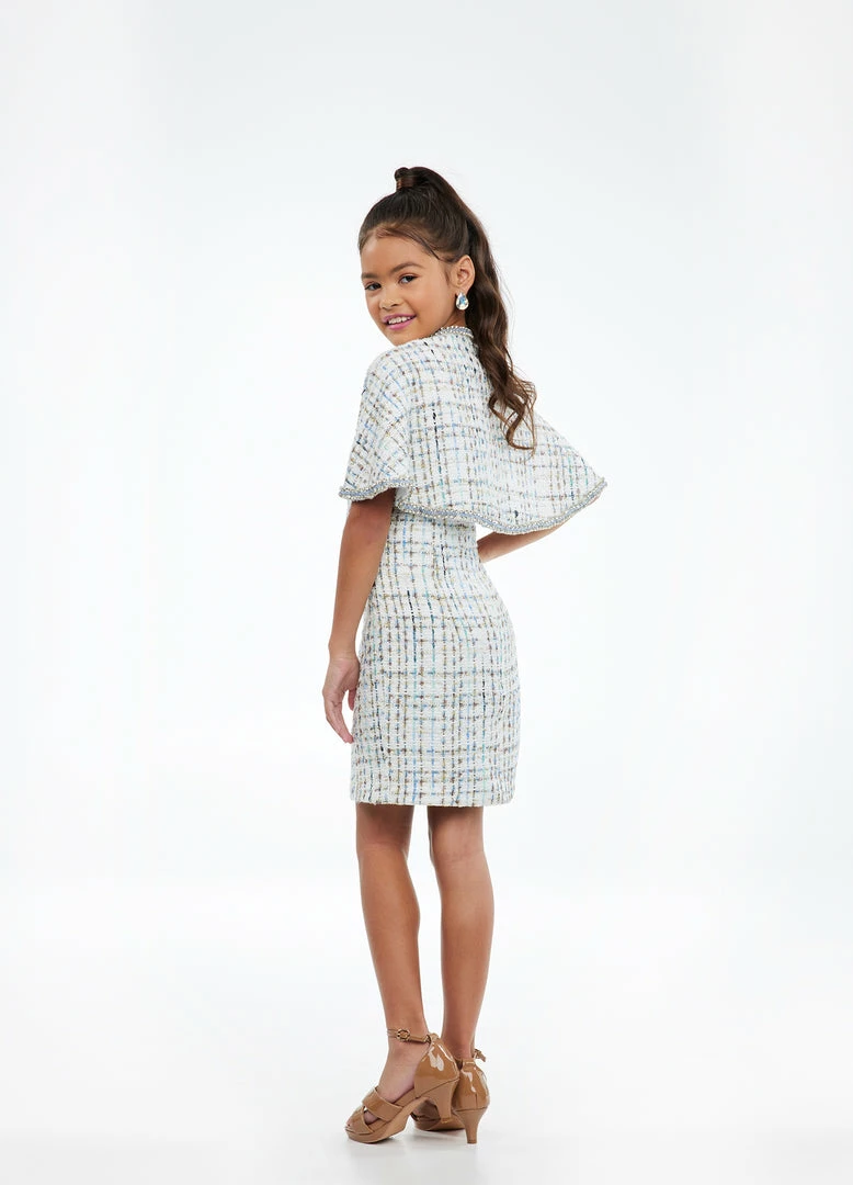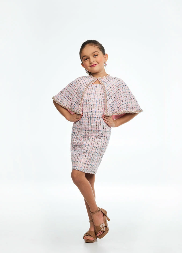 Ashley Lauren 8129 Girls Short fitted Tweed with Cape Pageant Wear cocktail dress This terrific fitted tweed cocktail dress features a square neckline. The removable tweed cape is perfectly trimmed in matching crystals.