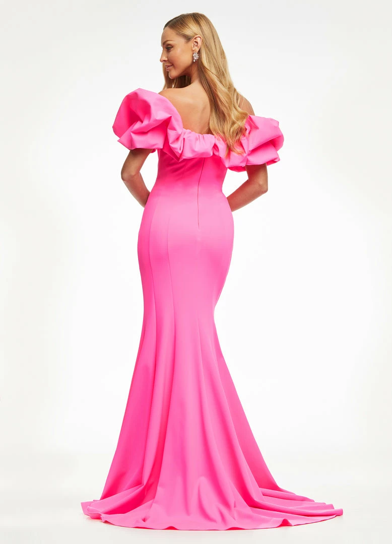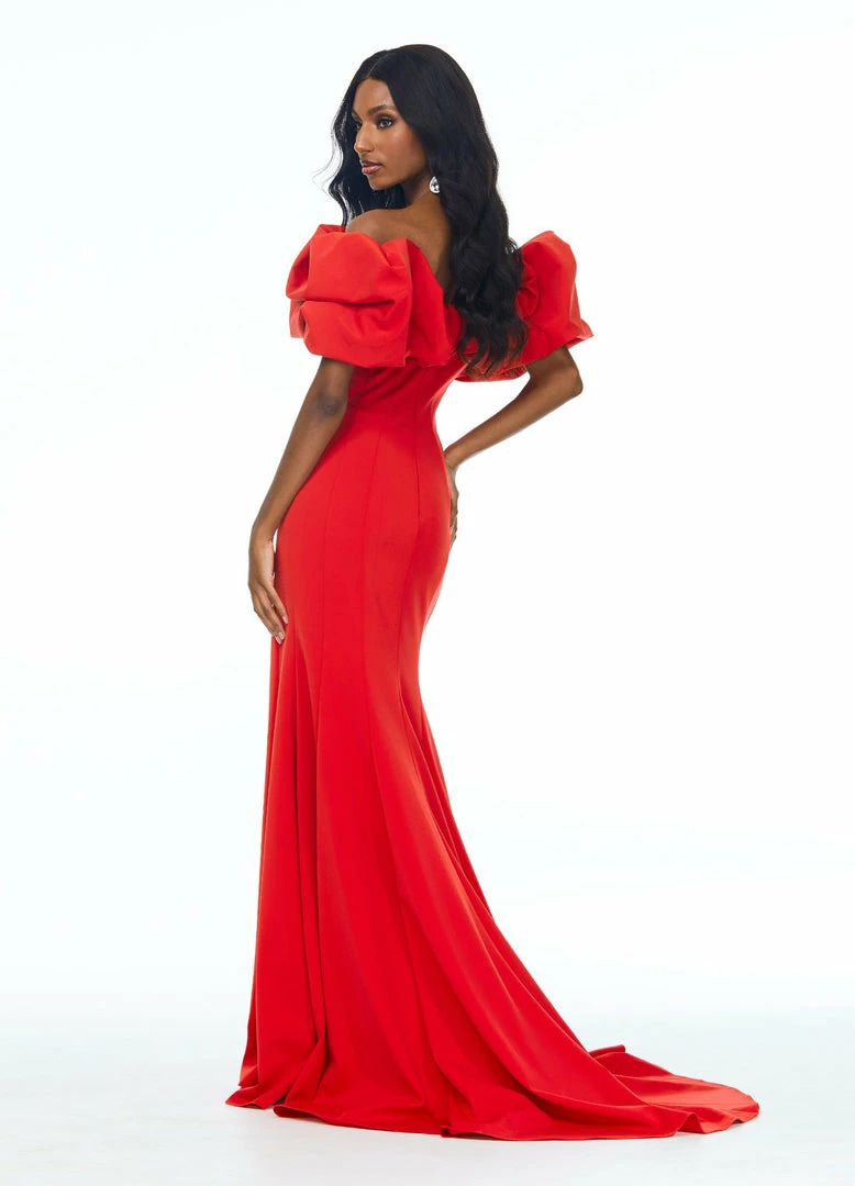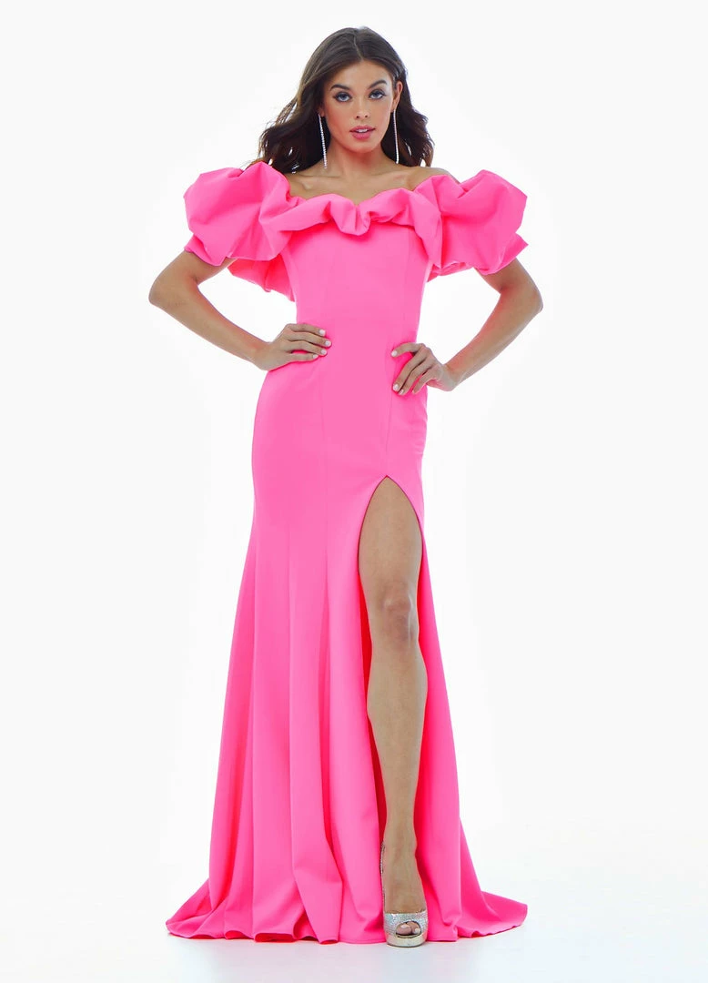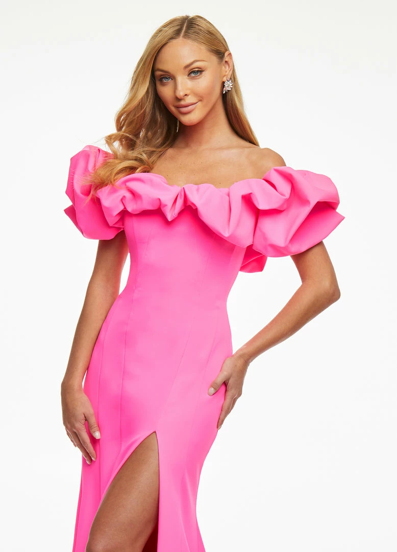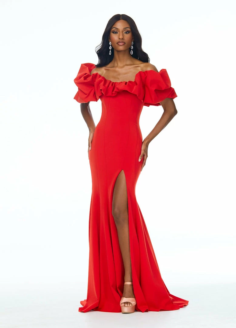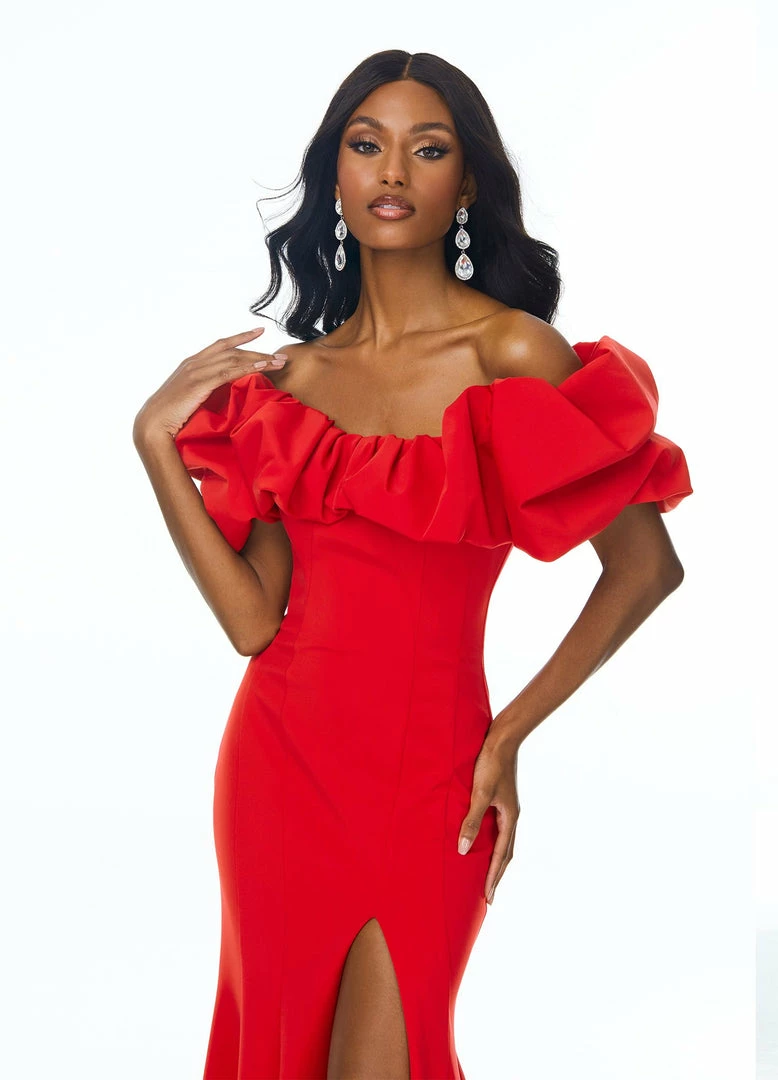 Ashley Lauren 11017 Wow in this off shoulder scuba evening gown. The off shoulder neckline is adorned with an oversized ruffle that perfectly frames your face. The fitted skirt is complete with a slit. Excellent Prom and Pageant Gown.