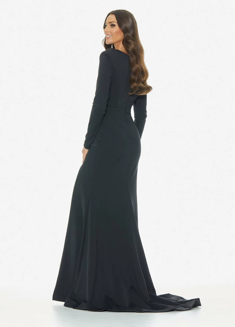 Ashley Lauren 11018Â Show off your figure in this long sleeve scuba evening dress. The crew neckline bustier includes an asymmetrical illusion cut out. The skirt is complete with a left leg slit and horsehair.
