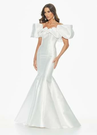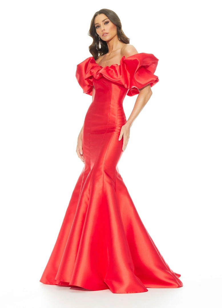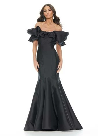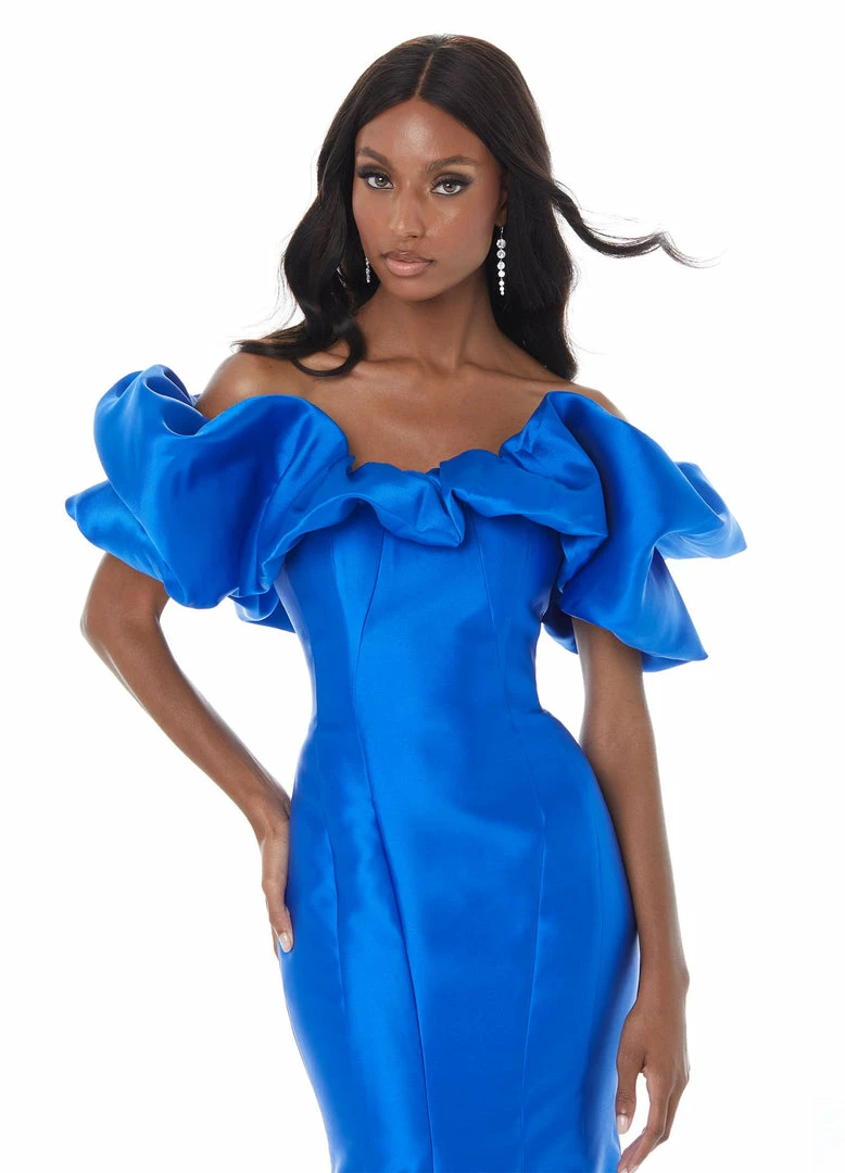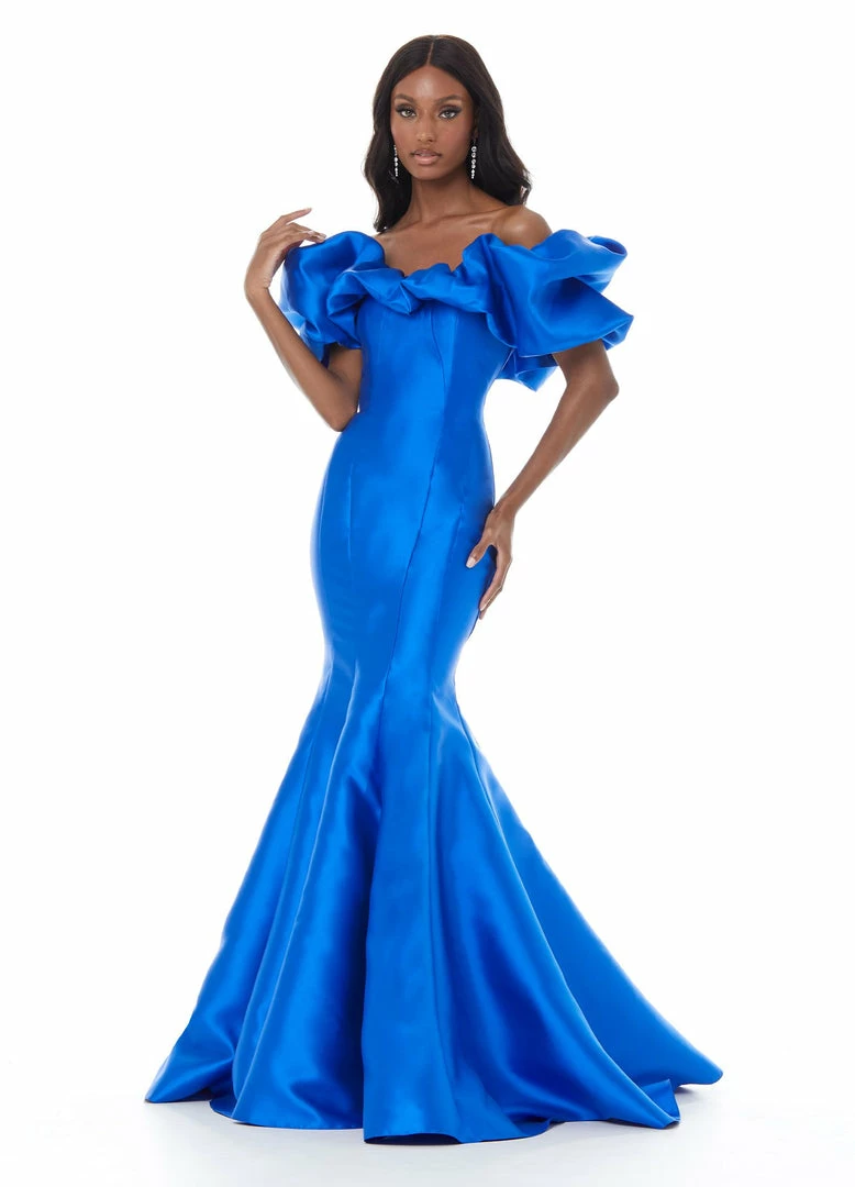 Ashley Lauren 11057Â Major drama in this stunning off the shoulder evening gown featuring a puff ruffle. The look is completed with fit and flare skirt with sweeping train. Makes an excellent Pageant Dress. Prom, Pageant and Formal Evening Wear Dress.