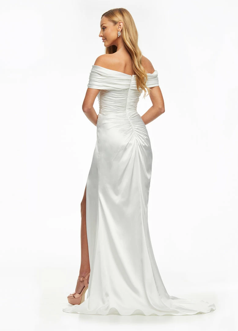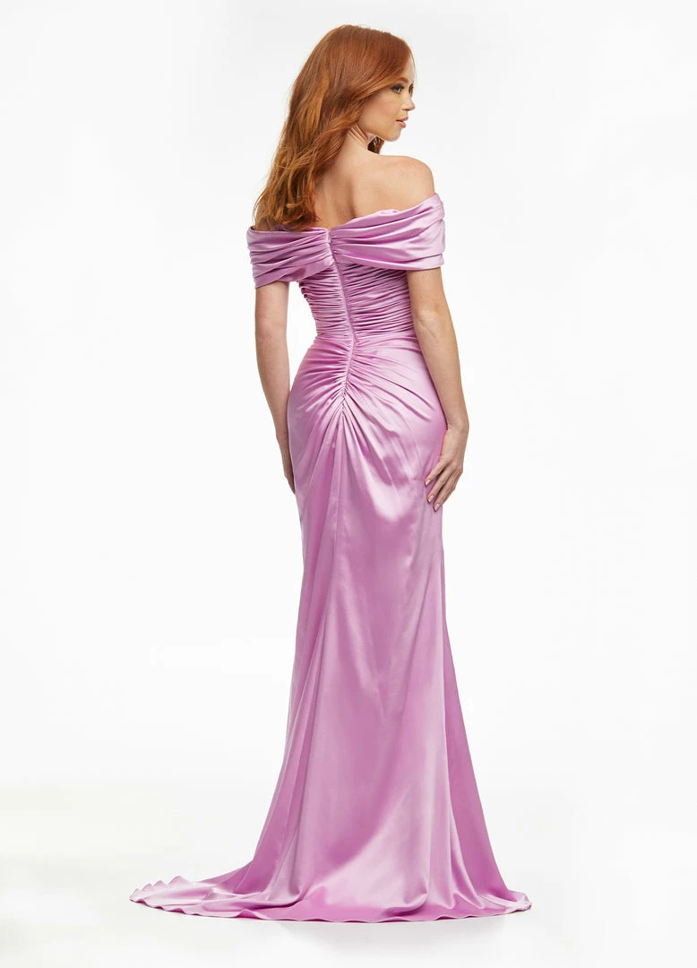 Ashley Lauren 11093 Lilac Prom Dress. This is a lovely off the shoulder satin ruched prom, pageant and formal evening wear dress. It has ruching past the waist and a maxi slit with a long train.