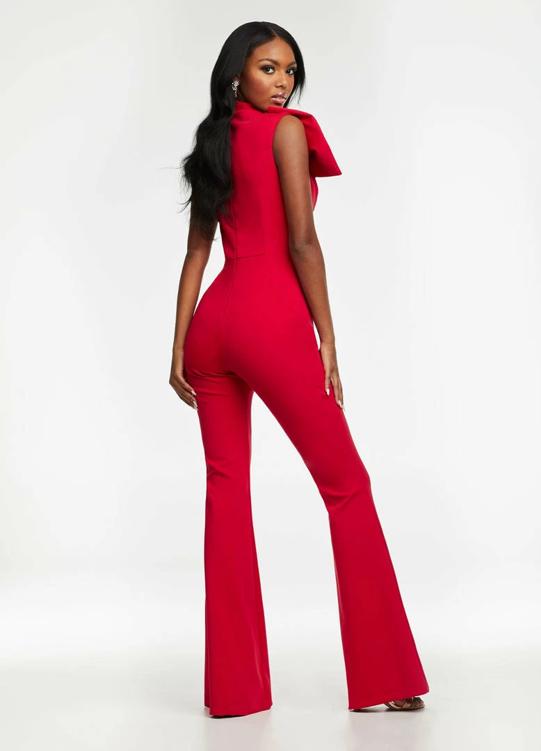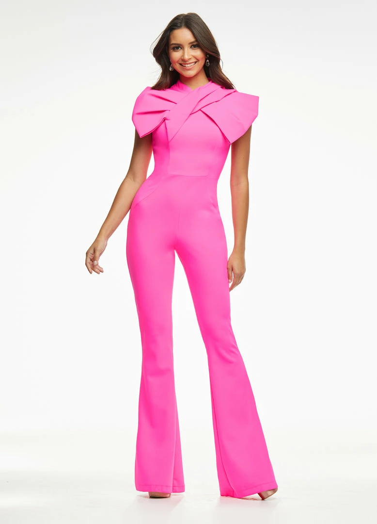 Ashley Lauren 11098 Jumpsuit. This cute jumpsuit has a large bow neckline that looks like it has been wrapped across your neck and shoulders. It is sleeveless with a high neckline and flared pants.