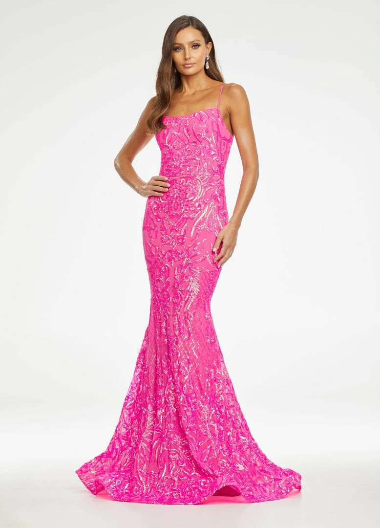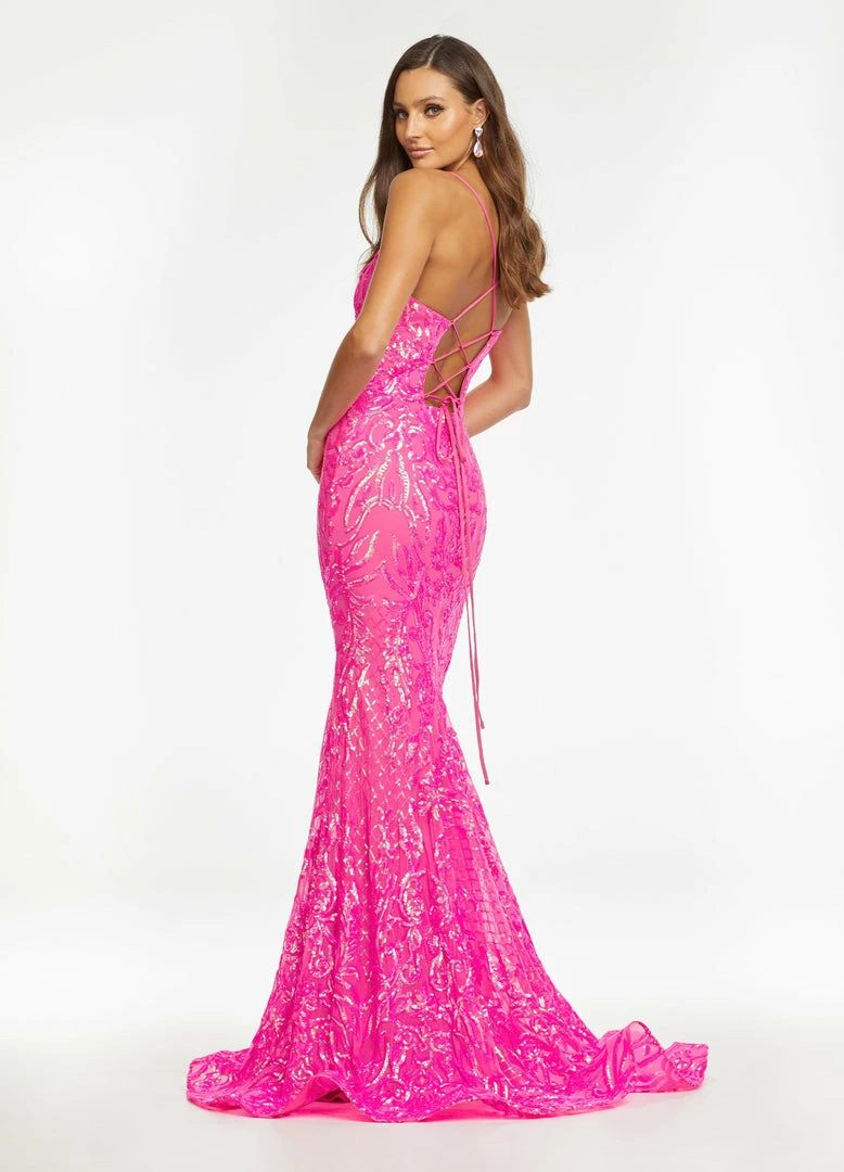 Ashley Lauren 11114 Spaghetti Strap Stretch Sequin Gown with Lace Up Back