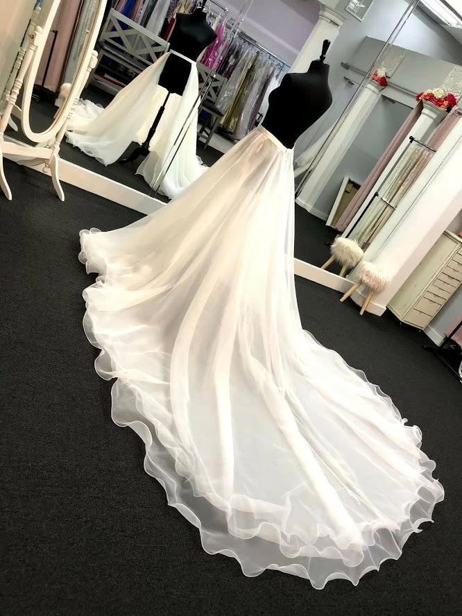 Add extra flair to your favorite dress, romper, bodysuit or jumpsuit with this organza overskirt with wire hem. The skirt is complete with a sweeping train. This Over Skirt can be the Glamorous Touch to any Formal Wear Style Including Bridal & Wedding Gowns.Â