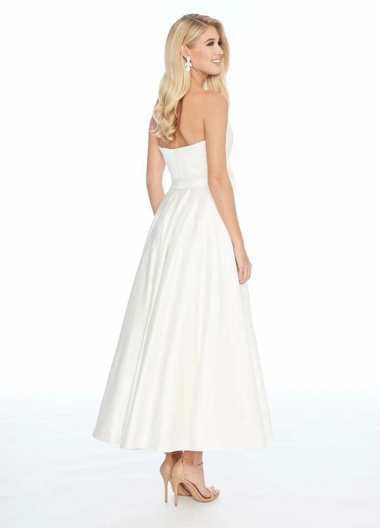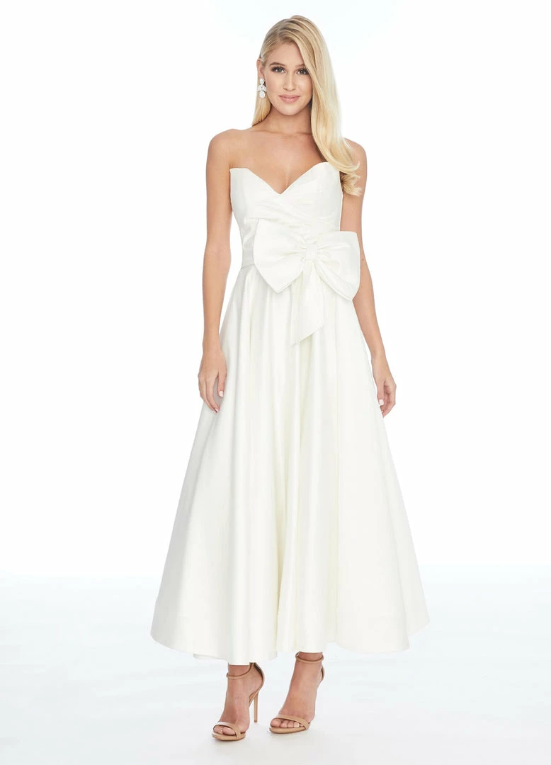 This tea length sweetheart gown has a removable belt and bow at the waist. This dress is perfect for your next social event or reception dress.Â