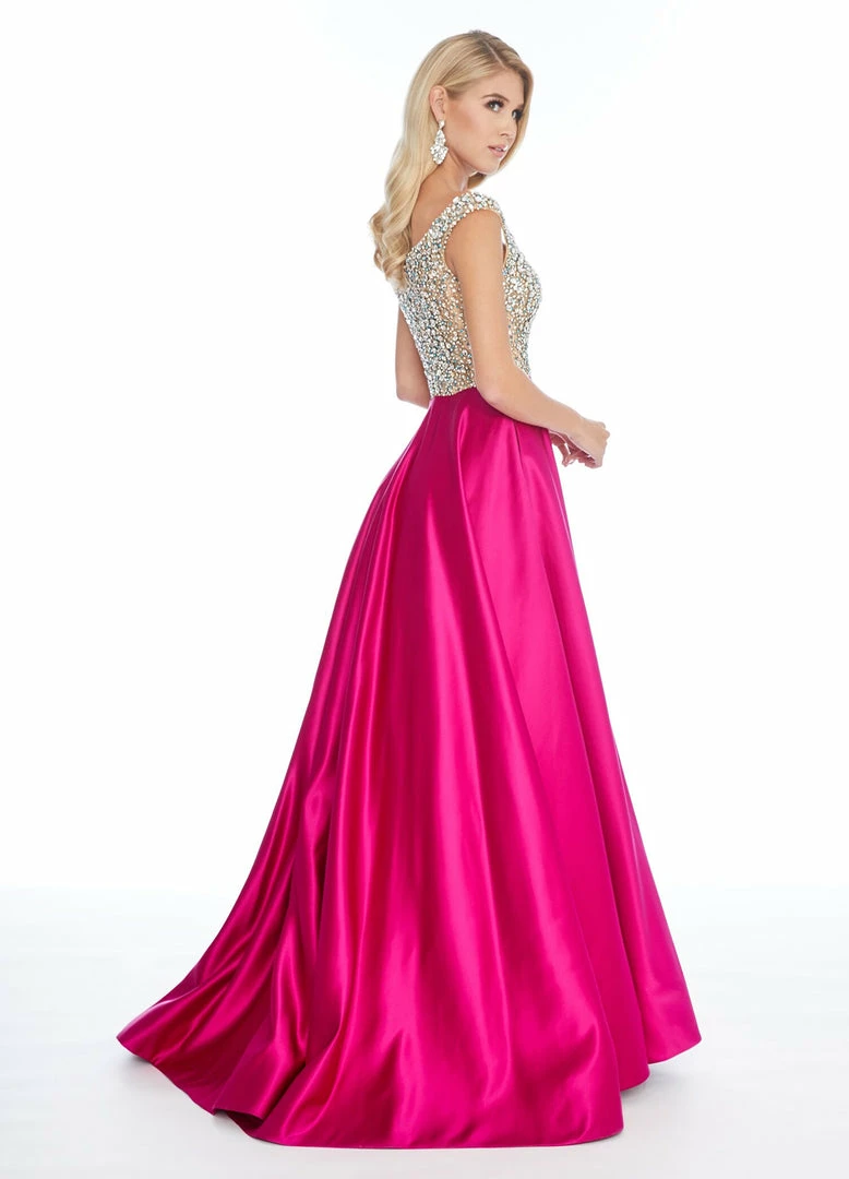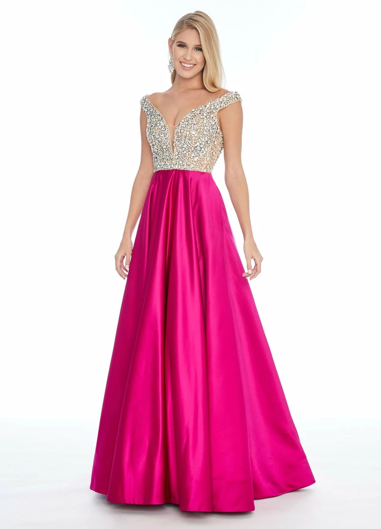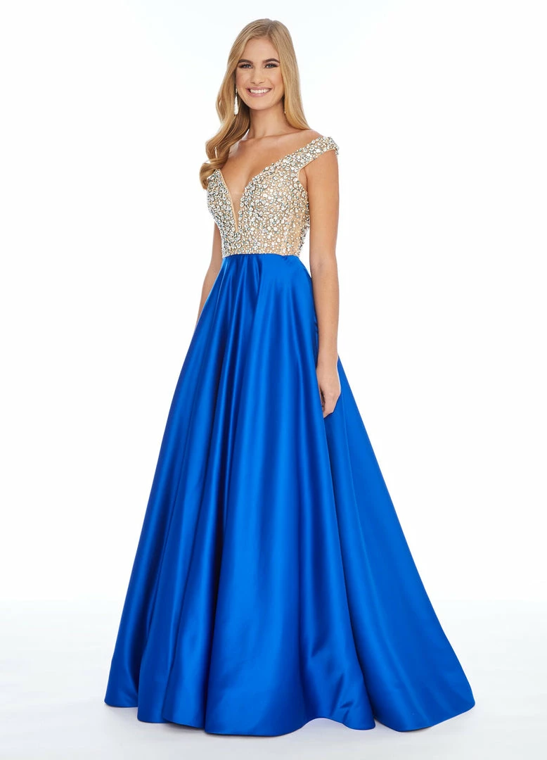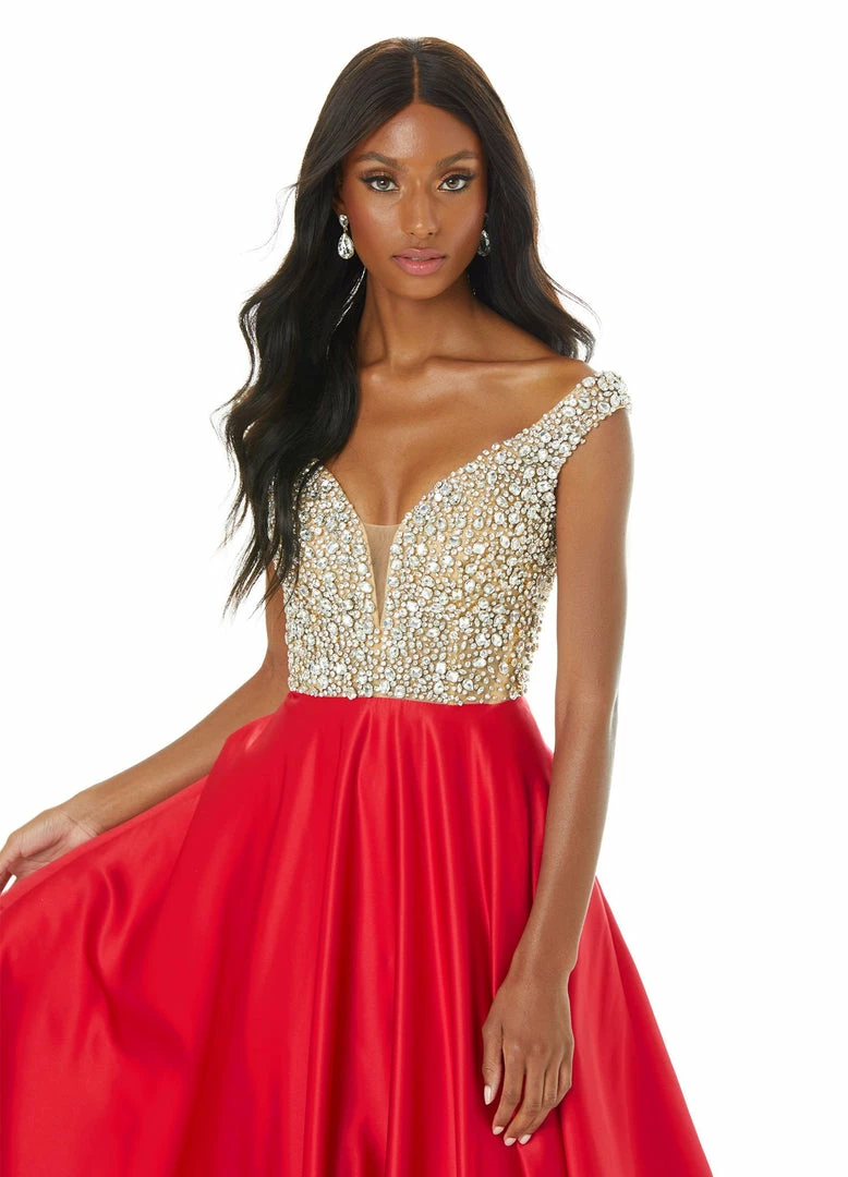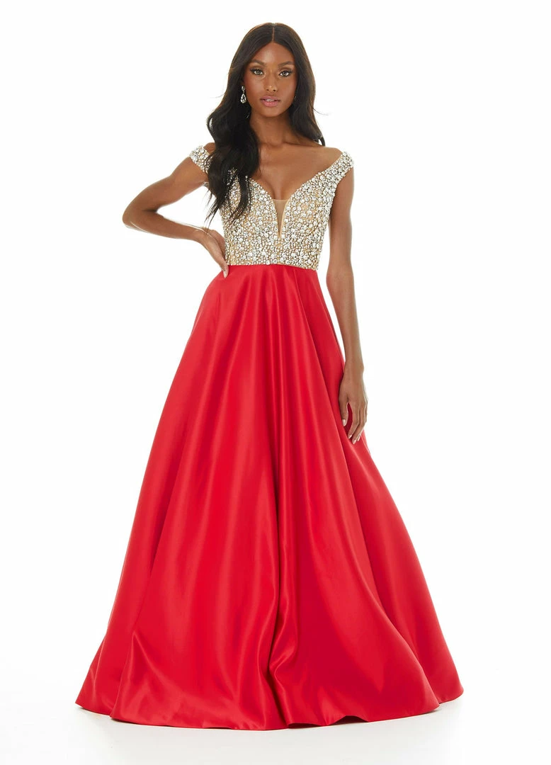 Ashley Lauren 1792 Off the shoulder beaded embellished bustier bodice and satin A line skirt with a train long pageant gown evening gown prom dress.