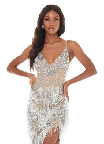 Flirty in fringe! This V-Neck gown has adjustable straps to provide the perfect fit. The fully lined skirt is embellished with an intricate bead pattern and fringe. This dress is finished with a slit.