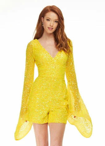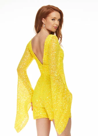 Ashley Lauren 4338 Yellow Romper, Cocktail wear, Pageant Wear.  Be fabulous in this hand beaded V Neckline romper featuring long sheer sequin bell sleeves. Also, did we mention it has pockets?!