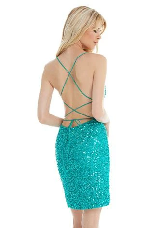 Ashley Lauren 4395 Blue Cocktail Dress. This is a short fitted sequin beaded cocktail dress or homecoming dress with open lace up tie corset back.
