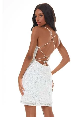 Be flirty and fun in this fully beaded cocktail dress with lace-up back.