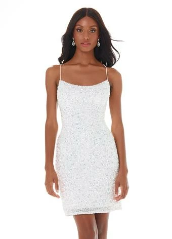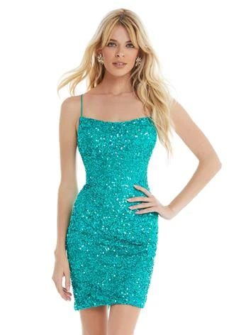 Ashley Lauren 4395 JadeCocktail Dress. This is a short fitted sequin beaded cocktail dress or homecoming dress with open lace up tie corset back.