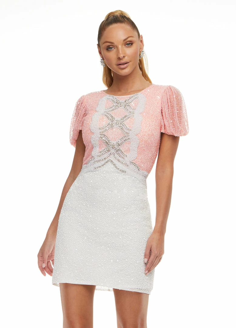 Ashley Lauren 4441 Black Ivory Cocktail Dress. Get noticed in this short fitted hand beaded cocktail dress. This dress features beaded puff short sleeves, high neckline and has three crystal bow details on the bodice of the dress. Favorite for your next pageant.Â