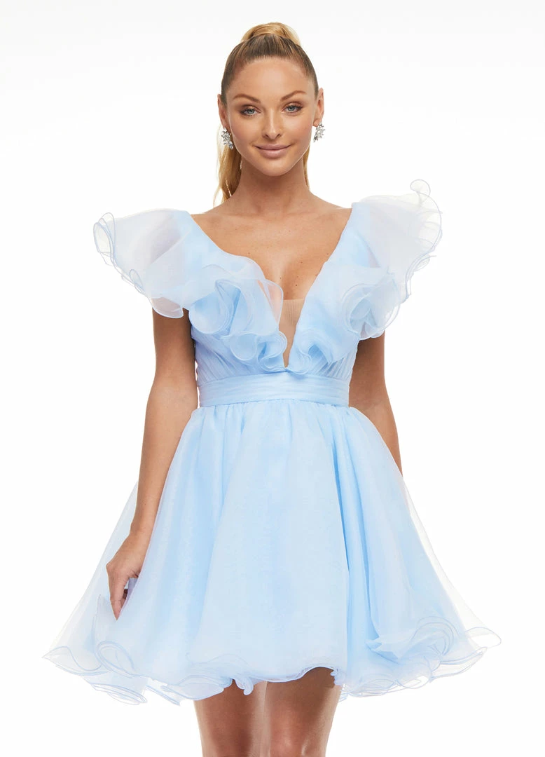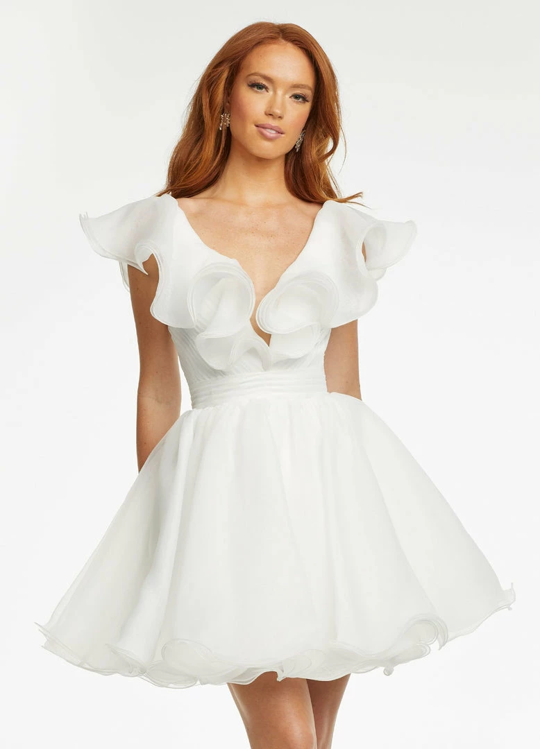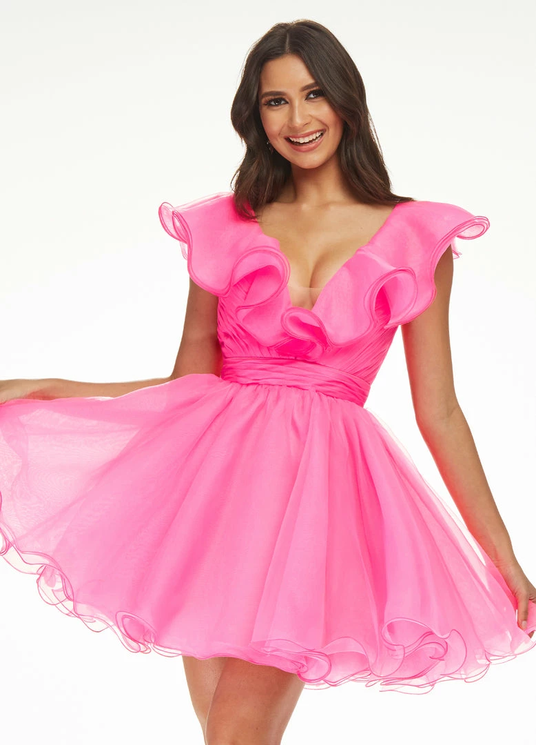 Ashley Lauren 4464 Cocktail Dress. This fun short dress is made of organza with a wire hem to create ruffles. It has a v ruffle neckline and ruched bodice.