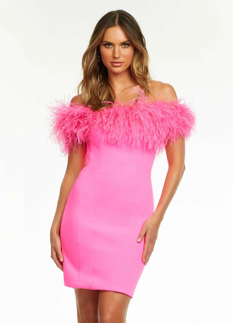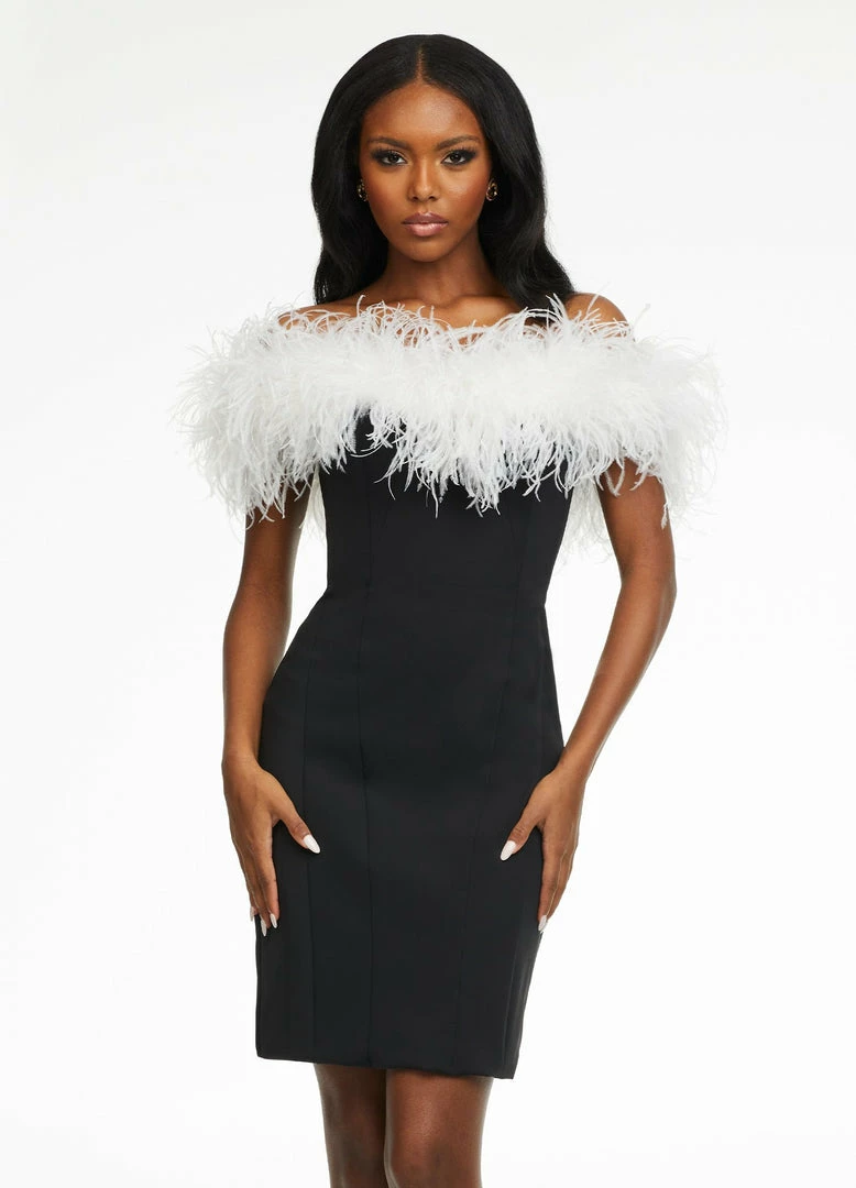 Fitted off the shoulder scuba cocktail dress accented with feather details.