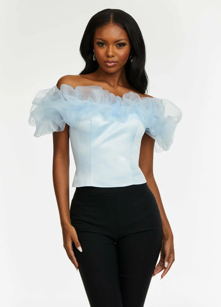 Ultra chic off the shoulder satin top is accented by an organza puff ruffle. This bustier would be perfect with jeans or for pageant headshots.