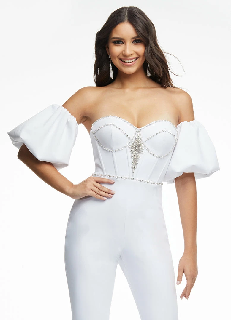 Ashley Lauren 11087 Hot Pink Jumpsuit. This is a must have jumpsuit. This amazing jumpsuit starts with an embellished sweetheart neckline and bustier bodice. It has flared pants legs and the big feature on this jumpsuit is detachable puff sleeves. Great stand out piece for your next pageant.