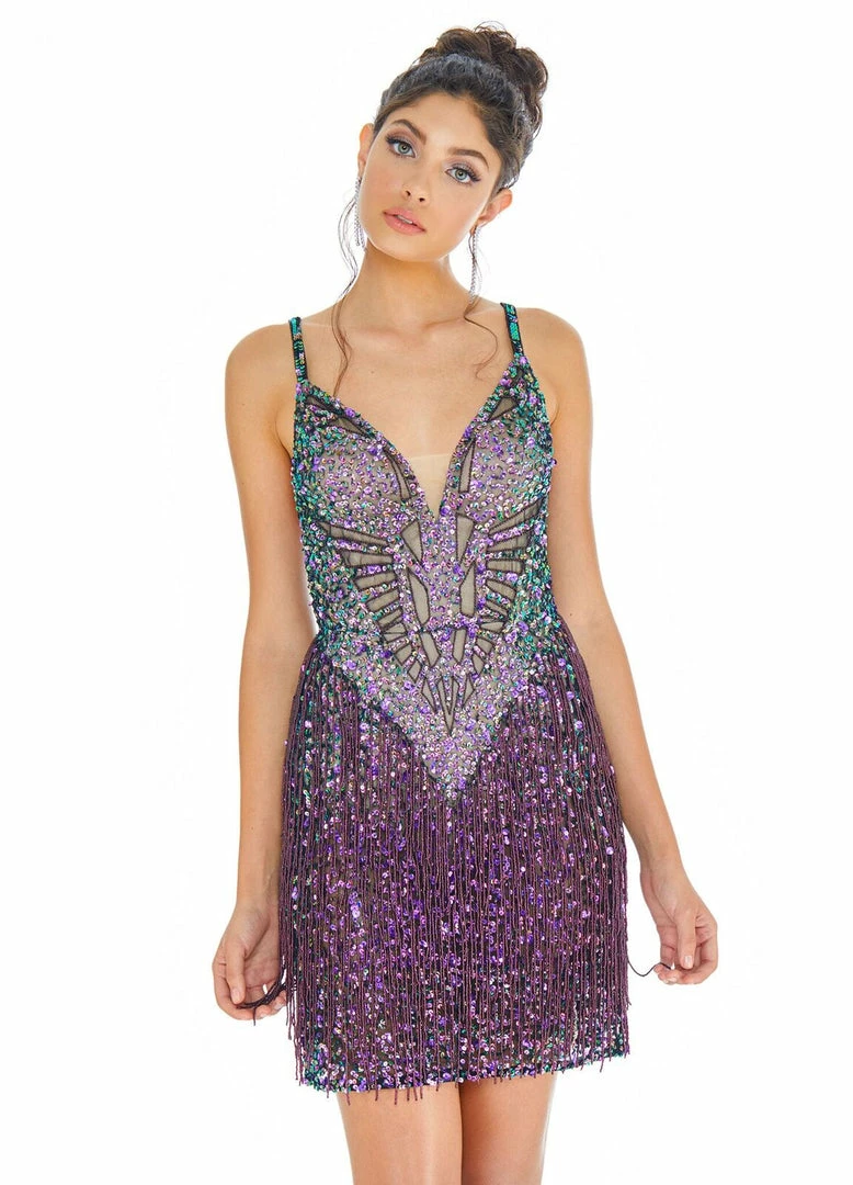This plum fringe cocktail dress is perfect for dancing all night long. The intricate bead pattern and fringe are sure to stand out. The dress is complete with a nude bodysuit.