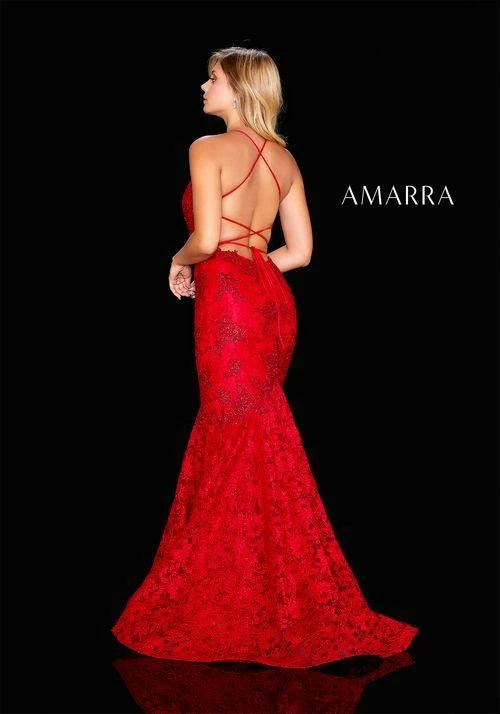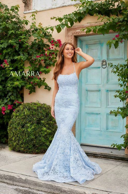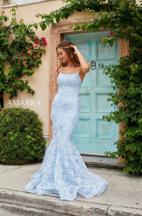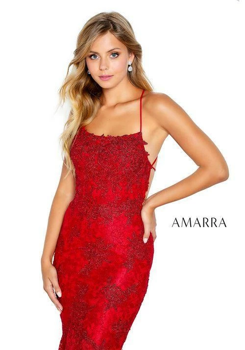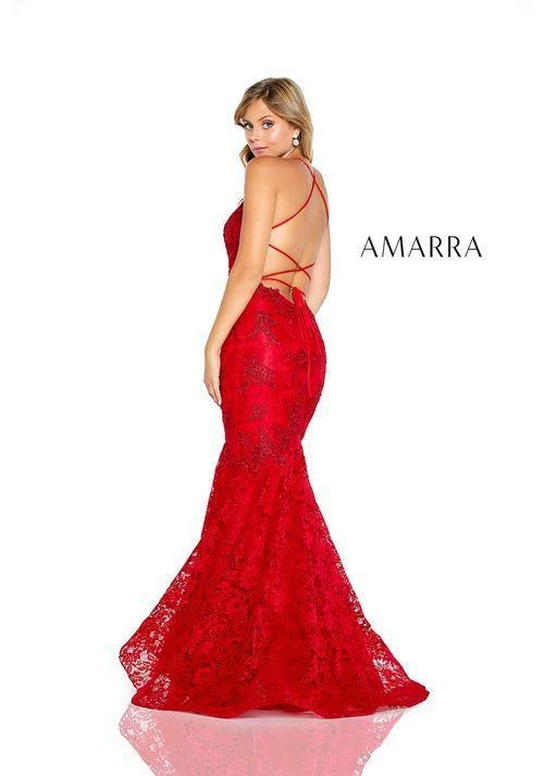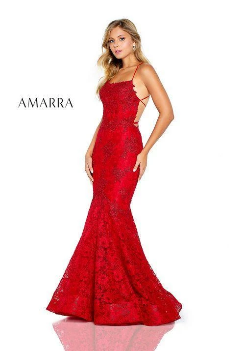 Amarra 20255 Embellished Lace Gown Lace Up Back And Mermaid Fit Prom Dress Lace dresses can be romantic, classic and sweet. Style 20255 reinvents that idea by giving this lace gown a sexy twist. This dress features a scoop neckline and mermaid fit. The lace up back gives this look drama and spice.