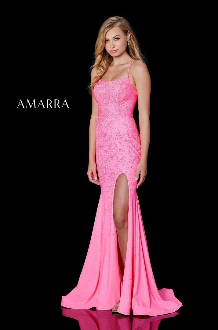 Amarra 87355 Long Fitted Rhinestone Jersey Backless Corset Prom Dress Slit Pageant Rhinestone jersey gown with a scoop neckline, leg slit, deep lace-up back, and train.Â