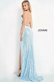 Jovani 1012 is a Delicate all over sequin Embellished Prom Dress with Floral Appliques. Features a plunging neckline & Slit in the skirt. Small Train in Back.Â