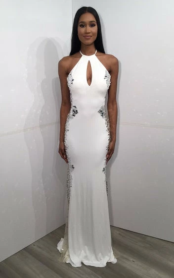 Jovani 1126 is along fitted stretch jersey Formal evening gown. Featuring a high neckline with a keyhole cutout. Backless prom design with straps. Sheer side panel with mesh running the length of this Pageant gown. Cut Glass paillette embellishments adorn the sheer side.