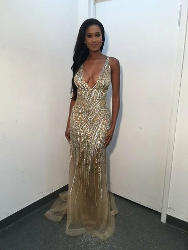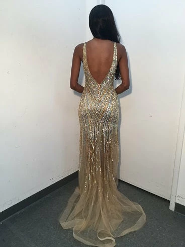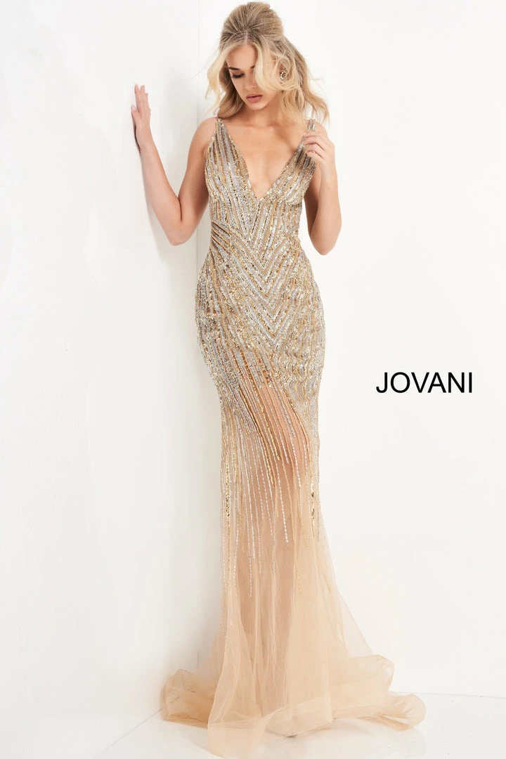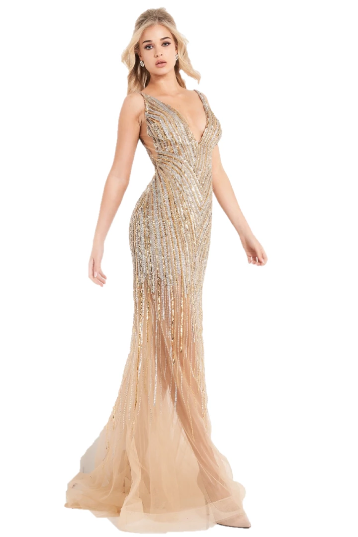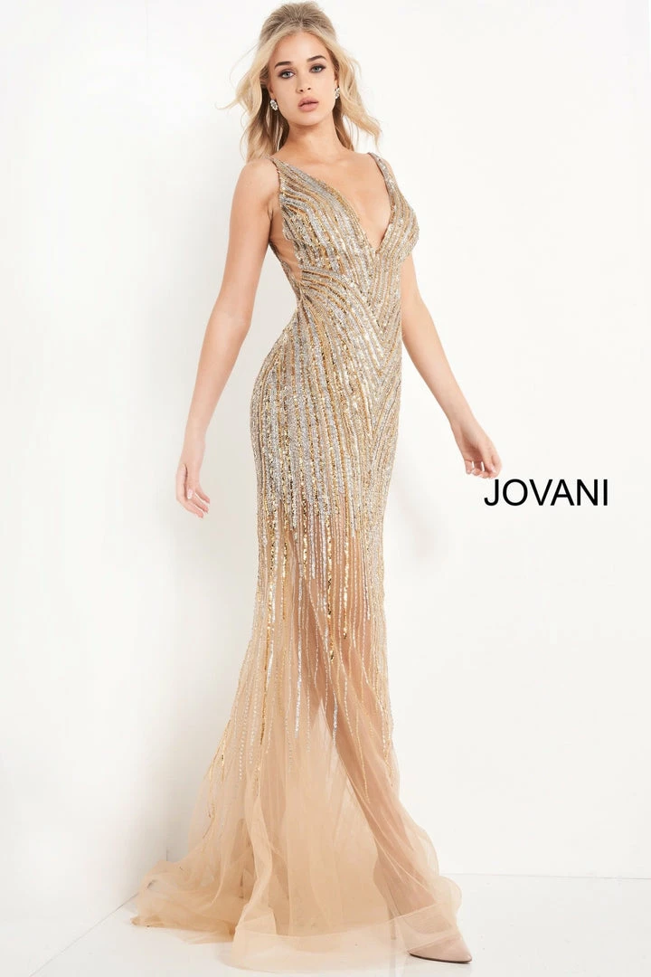 Jovani 1162 is a long fitted formal Embellished Evening Gown. Featuring a fully Embellished & Beaded asymmetrical Sequin pattern on Sheer material cascading down from the fitted bodice into the sheer trumpet skirt with horse hair trim. Deep V Neckline with an open V Back. This Prom Dress Fit & Flare Gown Features a sweeping train.