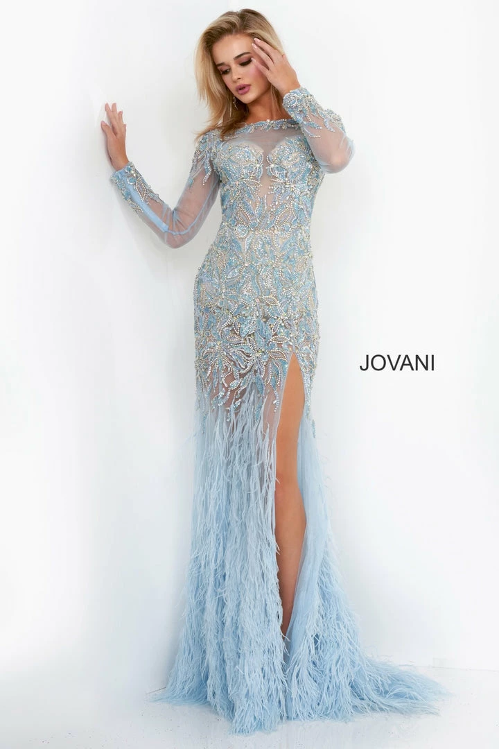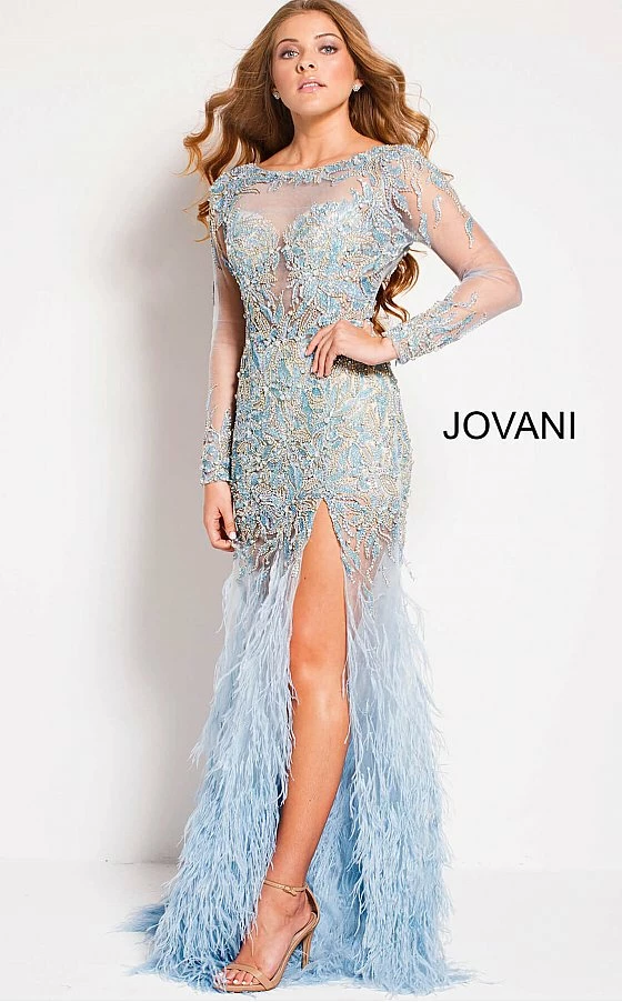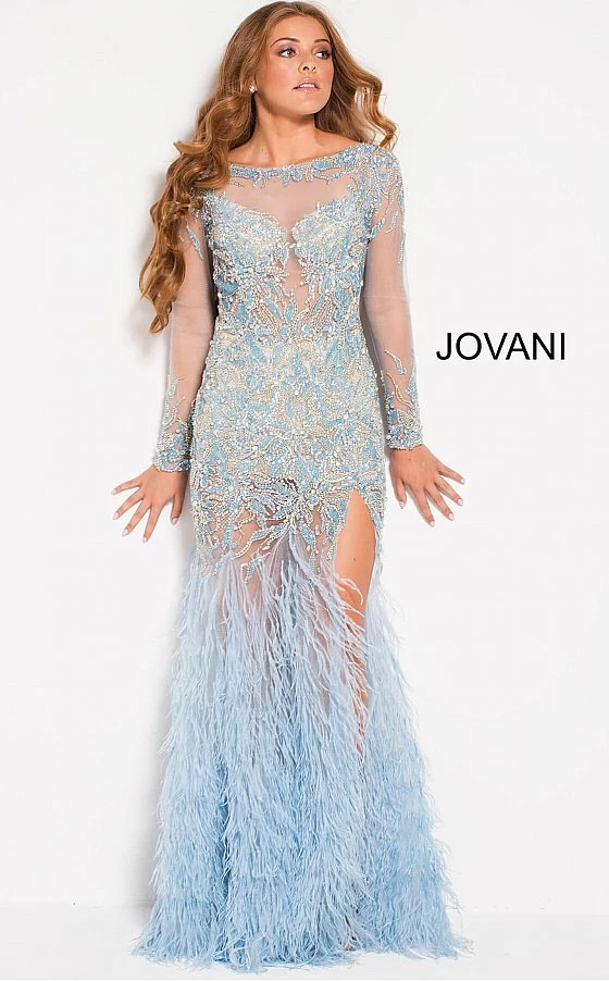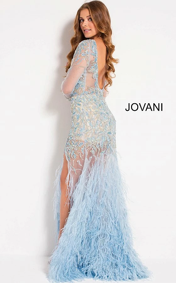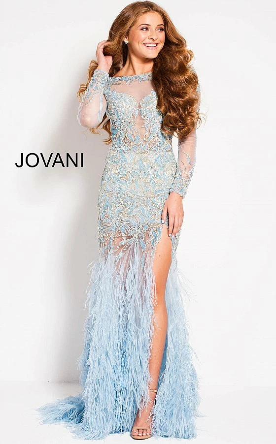 Jovani 37580 is a long Sheer Crystal Rhinestone Embellished Pageant Dress Featuring Long Sleeves and an open drop back. This backless formal evening gown has a Feather accented flared Skirt with a Slit. Lush sweeping train. Perfect Pageant Dress in light Blue or sexy formal party red carpet gown in black!