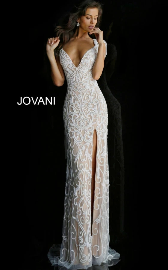 Jovani Bridal JB48274 Heavily Embellished Column Wedding Dress Cutout Back Fringe