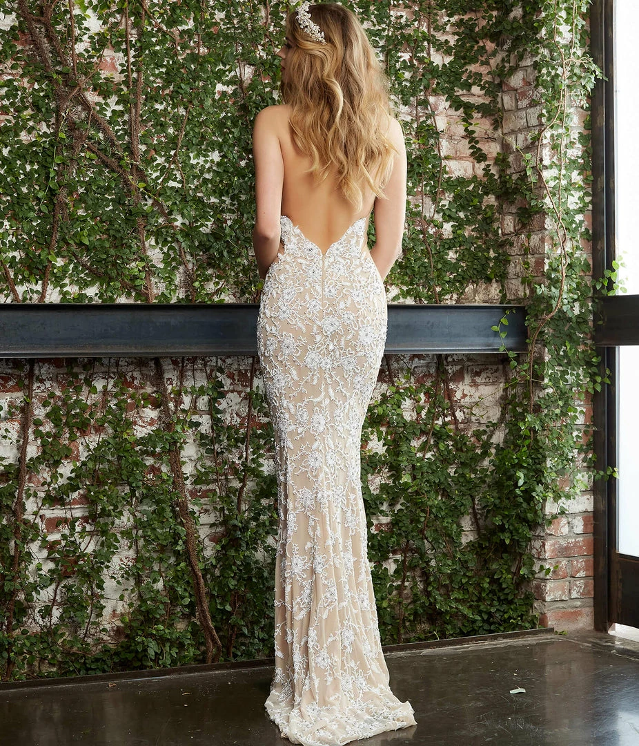 Jovani Bridal S48484 off white and nude wedding gown is encrusted in intricate floral beadwork, with a deep plunging halter neckline and an open back. Mesh side panels contour this fitted bridal dress, finished off with a sweep train. Halter Backless Fitted Beaded V Neck Wedding Dress Couture