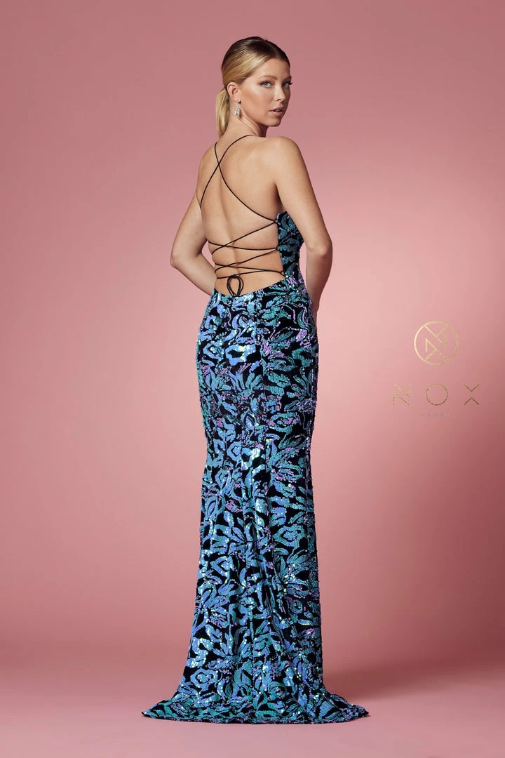 Nox Anabel R427 Long Fitted Sequin Backless Corset Formal Prom Dress Slit V Neck