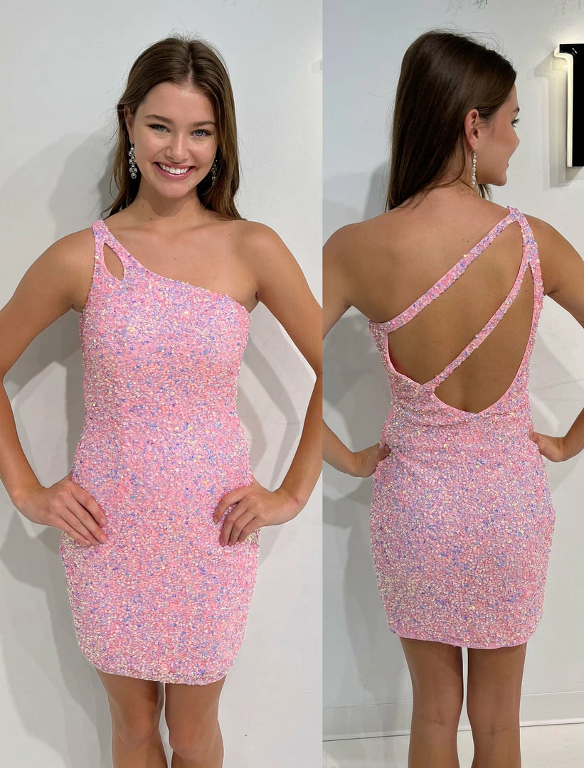 Primavera Couture 3573 This is a Super Amazing Cocktail Dress. This Fresh Style has a one shoulder double strap that wraps across the open back. It is fitted and sequined in all of the hottest colors. Great for cocktail hour, party, homecoming dress.