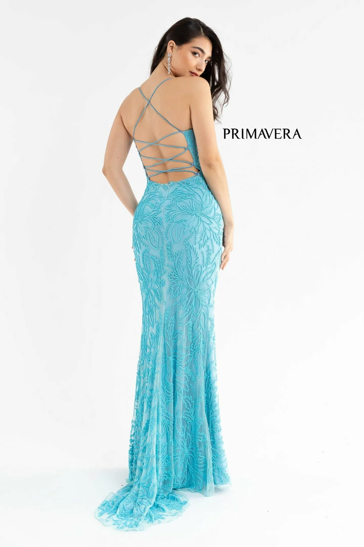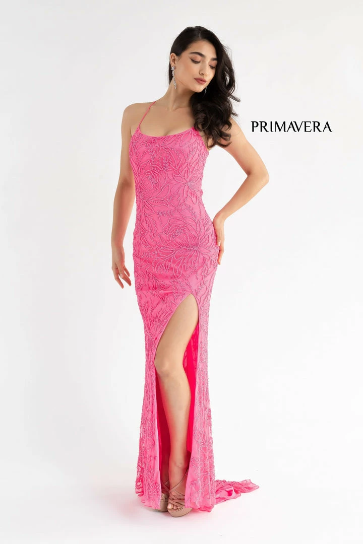 Primavera Couture 3786 This is a beautiful Scoop Neckline Prom Dress with beaded large flowers throughout the evening gown. It has an open lace up tie back, a slit and a sweeping train. Perfect for Prom, Pageant or Evening Social Gatherings.