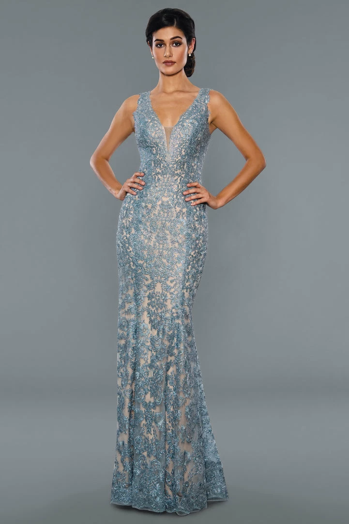 Stella Couture 18127 Long Fitted Shimmer Lace V Neck Dress Fit & Flare Gown