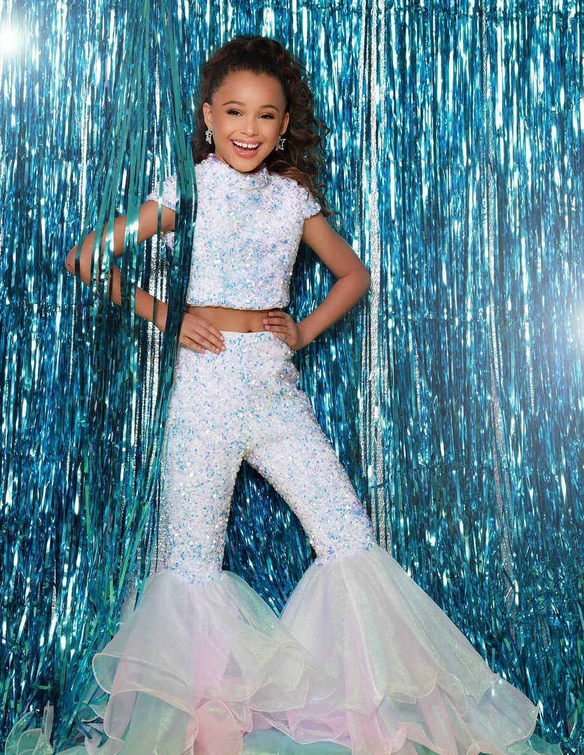 Sugar Kayne C164 This is a two piece girls fun fashion jumpsuit. Featuring Sequin stretch velvet fabric not only is it comfortable but glamorous on stage! high neckline with short sleeves, Backless with an organza bow to tie. Lush Bell Bottoms. Unicorn color features iridescent shimmer organza while royal and red feature regular organza.