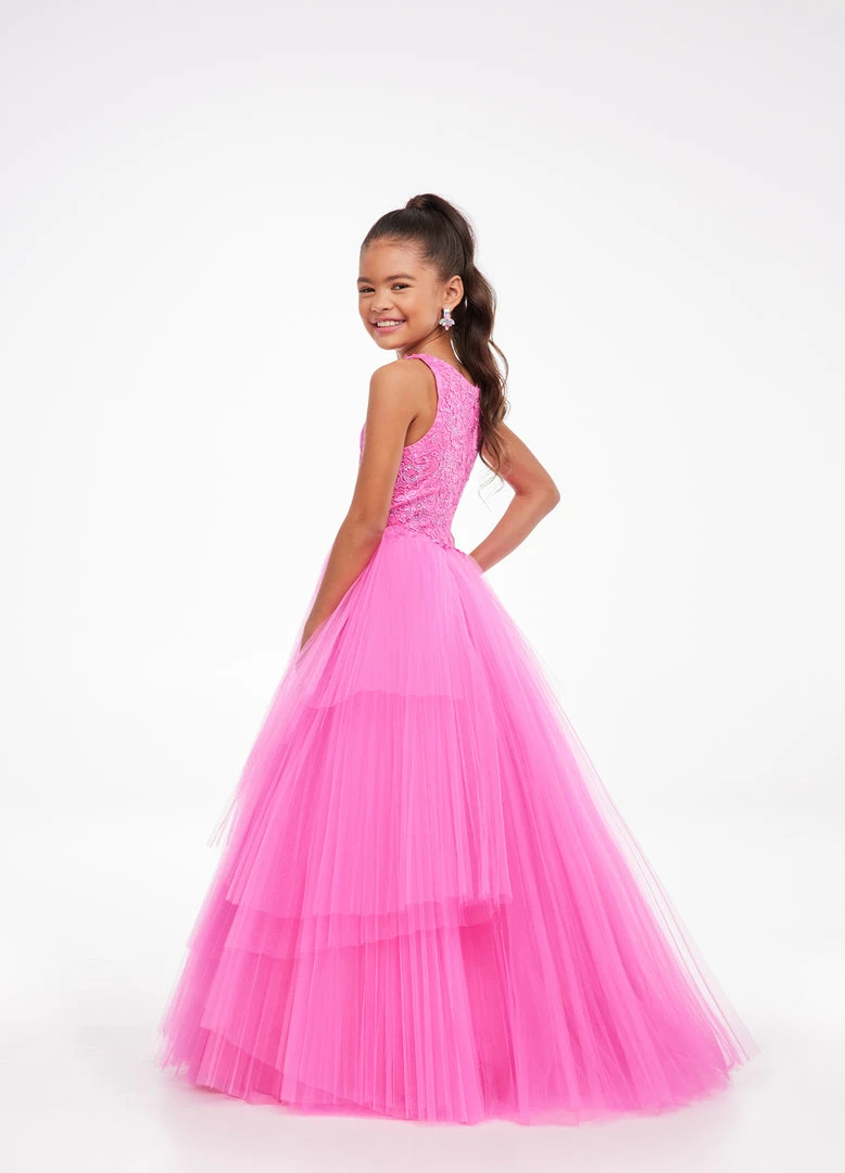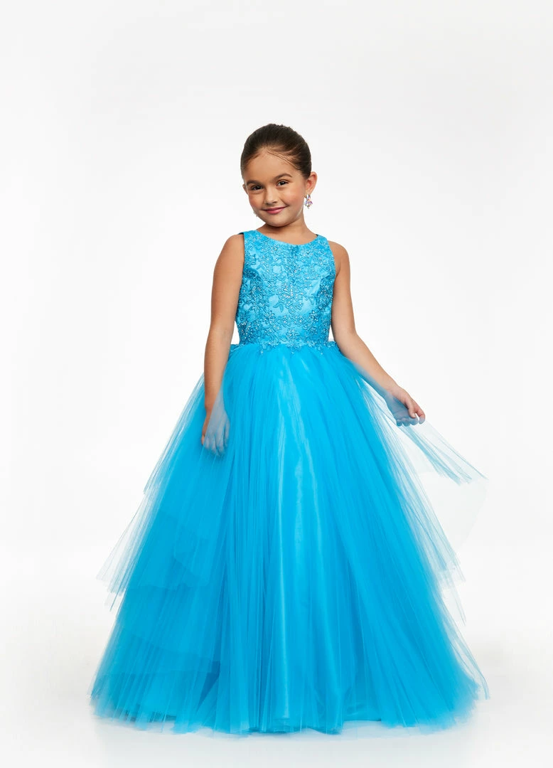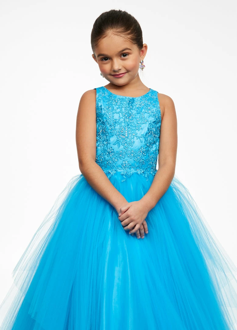 Ashley Lauren Kids 8105 Long Pleated Pageant A Line Ballgown Lace Bodice This elegant ball gown features embroidered lace applique throughout the bustier giving way to a pleated tulle skirt.