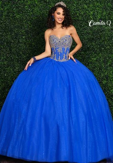 Camila Q Quinceanera Dress Q18007 This dress has a sweetheart neckline embellished with gold thread applique. The bodice is a corset with princess seam waist with full tulle skirt. Sweet Sixteen Dress